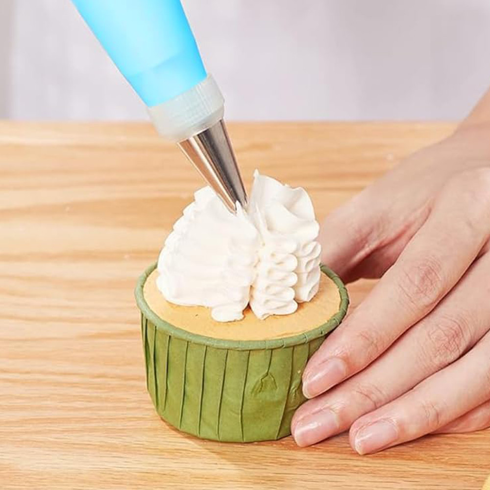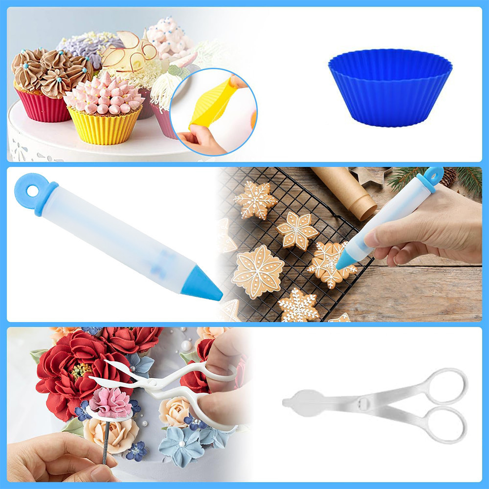 Balení obsahuje vše potřebné pro přesné a efektní zdobení: trysky, formy, stěrky, silikonové formičky na muffiny, otočný podnos a mnoho dalších doplňků pro svobodnou kreativitu.