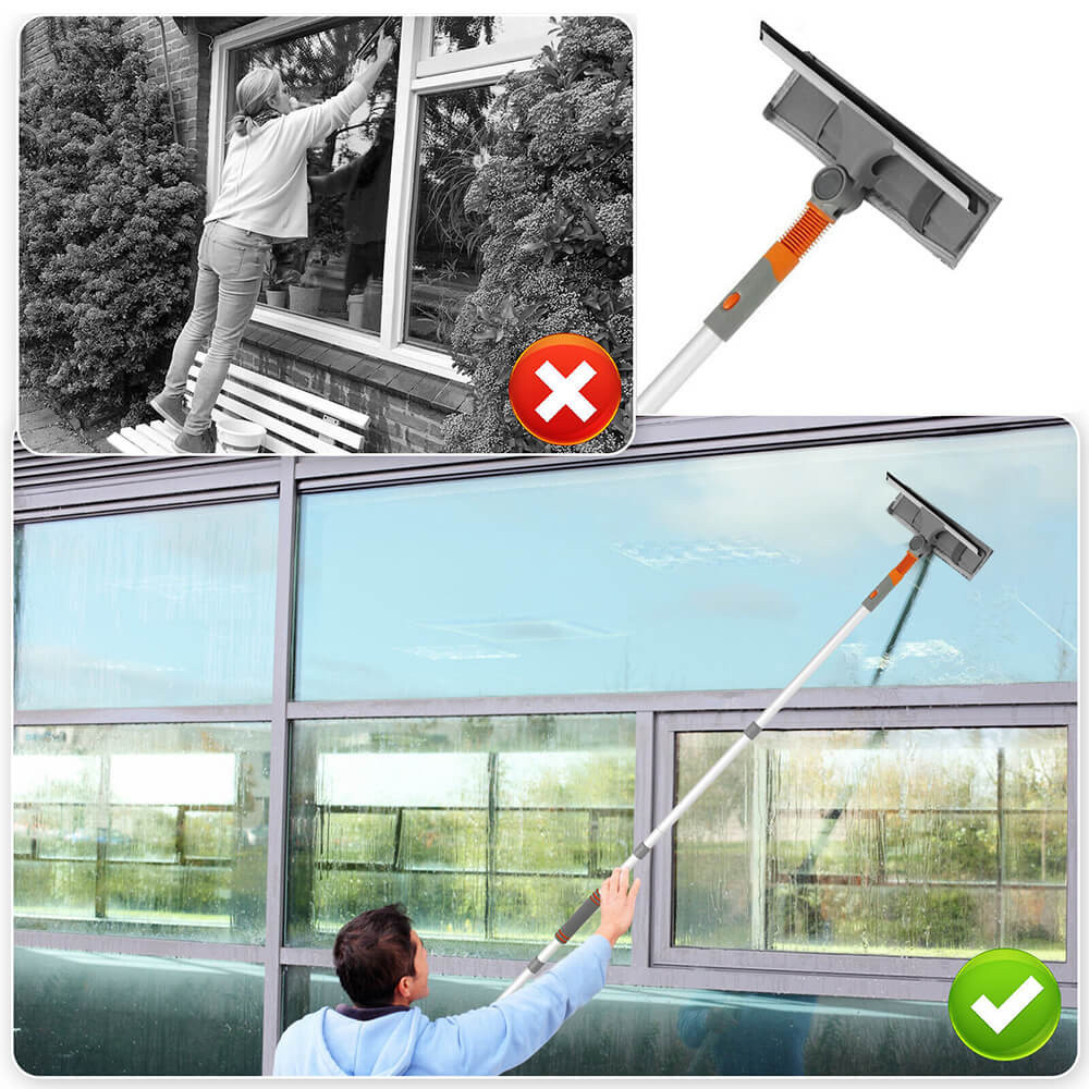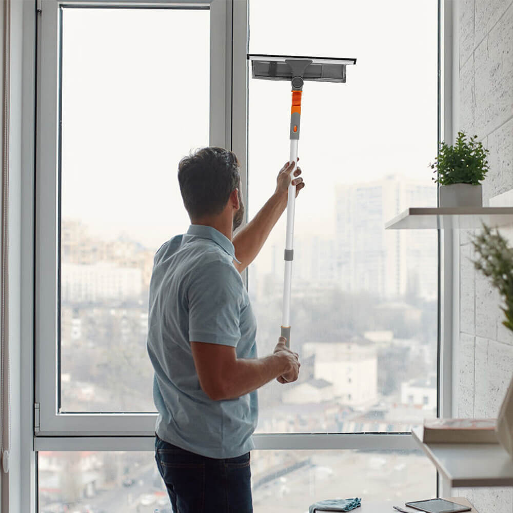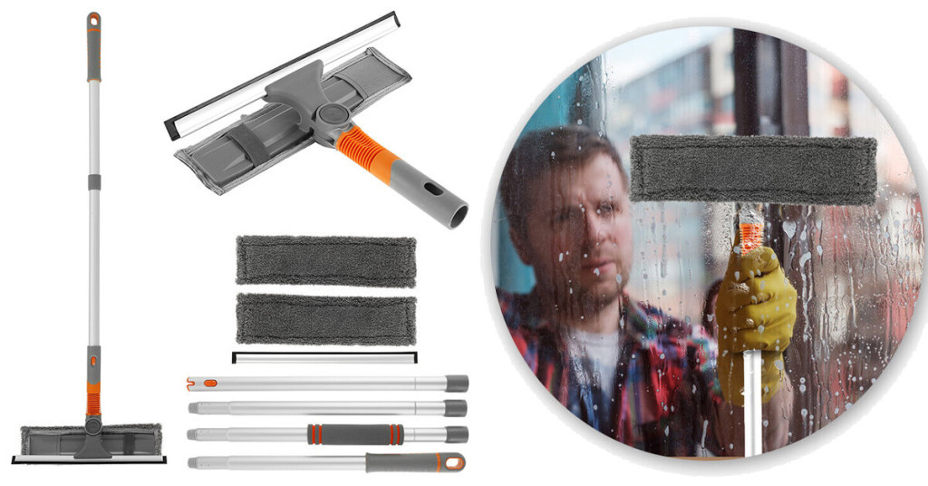 Teleskopická rukojeť s délkou až 163 cm vám umožní snadno dosáhnout na výše položená okna, obklady či jiné hladké povrchy. Hlavice, kterou lze naklánět v úhlu 180 stupňů, přidává sadě na univerzálnosti a usnadňuje použití.