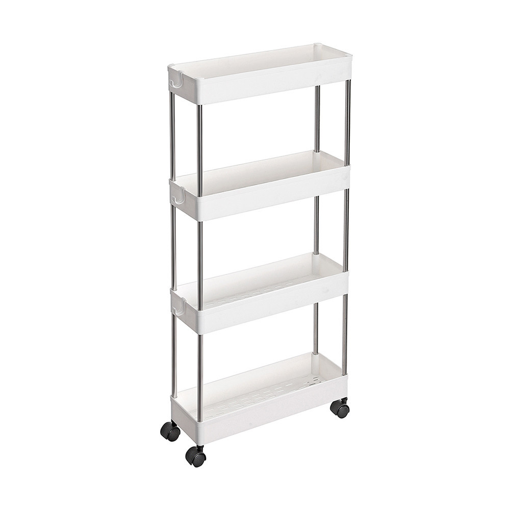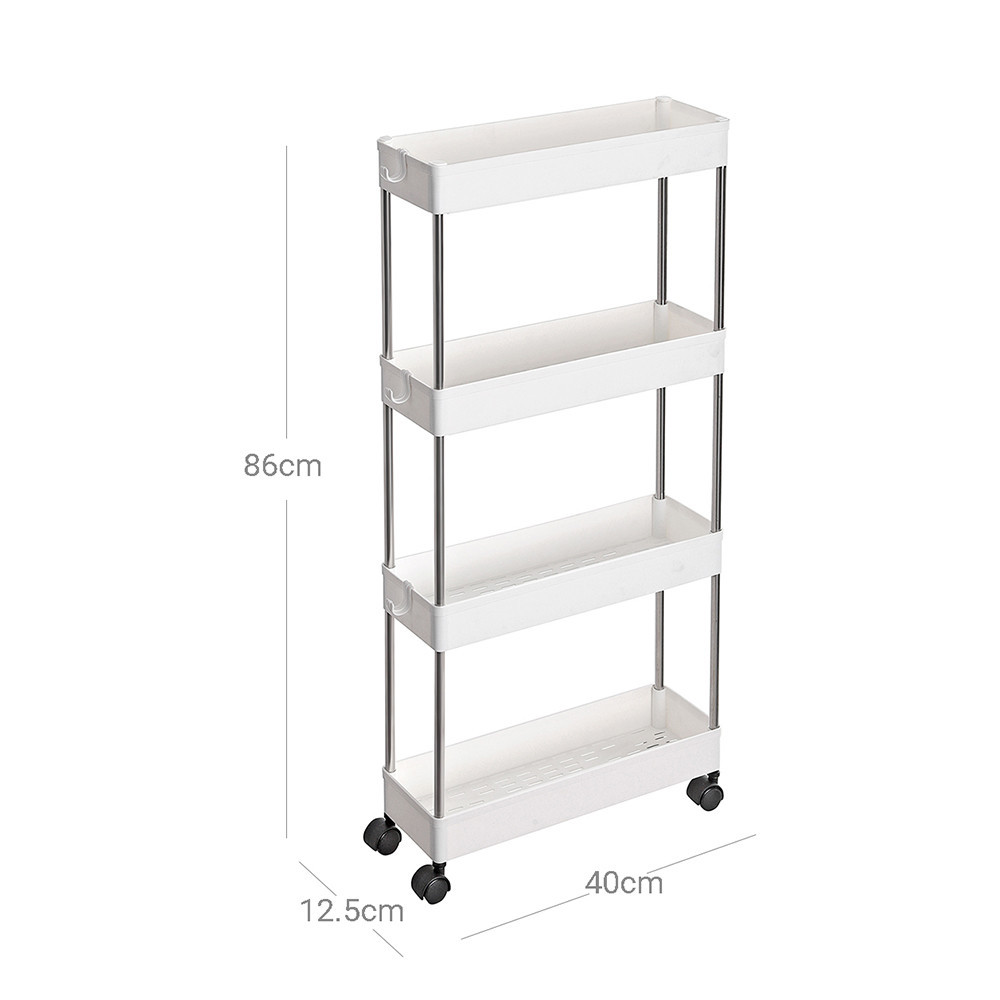 Šířka pouhých 12,5 cm umožňuje tomuto úložnému zařízení perfektně se vejít do úzkých mezer vedle lednice, dřezu nebo pračky. Na jeho 4 policích můžete snadno uspořádat každodenní předměty.