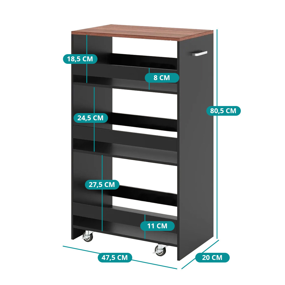 Čtyři patra usnadňují rozdělení věcí – nahoře často používané, dole větší lahve nebo zásoby. Okraje zabraňují sklouznutí věcí při posouvání vozíku.