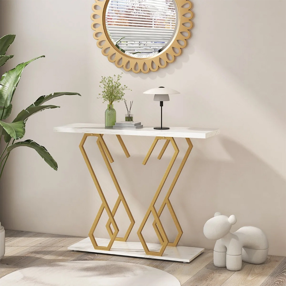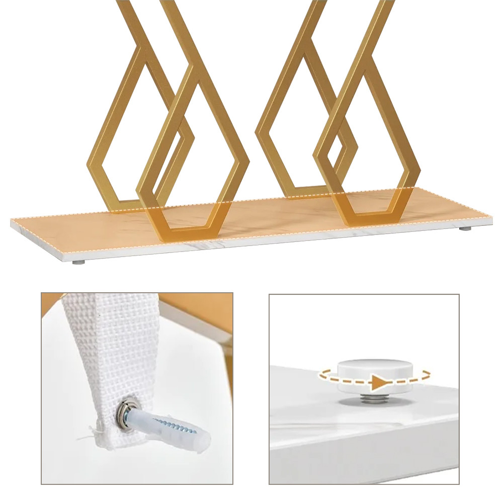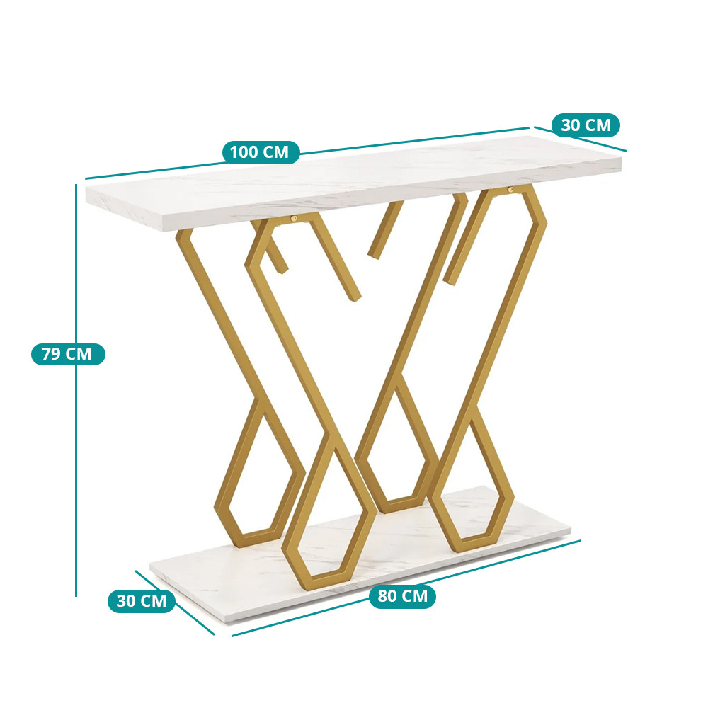 Mramorová bílá deska působí elegantně a zlaté geometrické nožky dodávají moderní charakter. Skvěle zapadne do čistých, moderních nebo glam stylů a vypadá dobře pod zrcadlem, na chodbě nebo v obýváku.