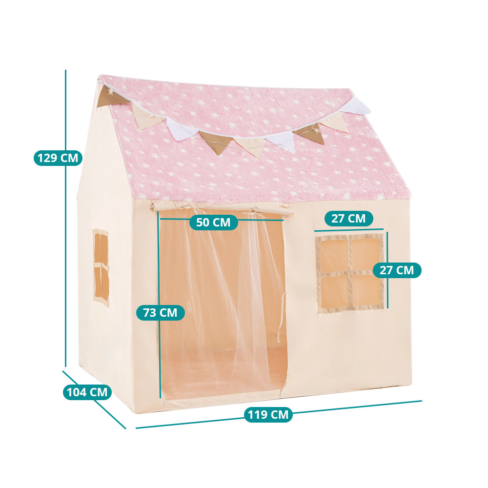 Růžová střecha s hvězdnými motivy jemně svítí ve tmě, což hře dodává zvláštní atmosféru. Teplé bílé osvětlení a malý girland s vlaječkami činí domeček přívětivým, takže i večerní pohádky nebo tichý odpočinek jsou pohodlnější.
