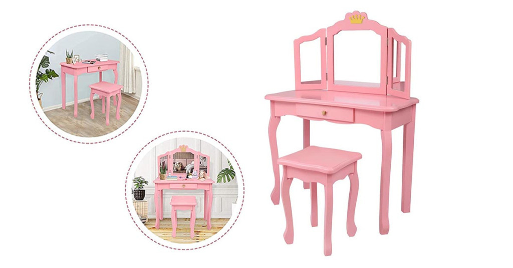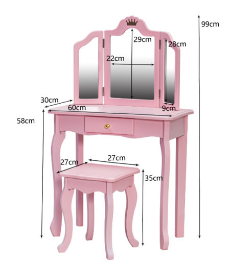 Stolek a křesílko jsou navrženy pro děti, což umožňuje malým slečnám pohodlně sedět a ponořit se do svých každodenních "beauty rutin." Křídla trojdílného zrcadla lze snadno sklopit, což zajišťuje bezpečnost a praktičnost.