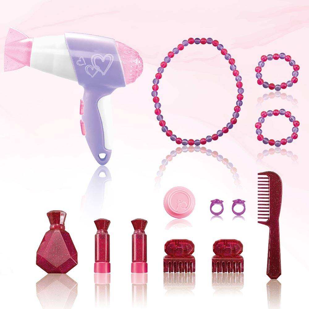 Stolek je vybaven úložnými prostory a zásuvkami, díky nimž budou všechny doplňky po ruce a vždy uklizené. Sada obsahuje šperky a kosmetické pomůcky – například náramky, náhrdelníky, prstýnky a lahvičky na parfém – které činí hru ještě zajímavější.