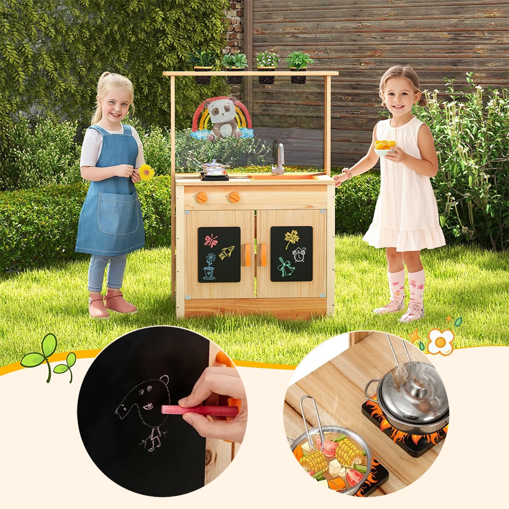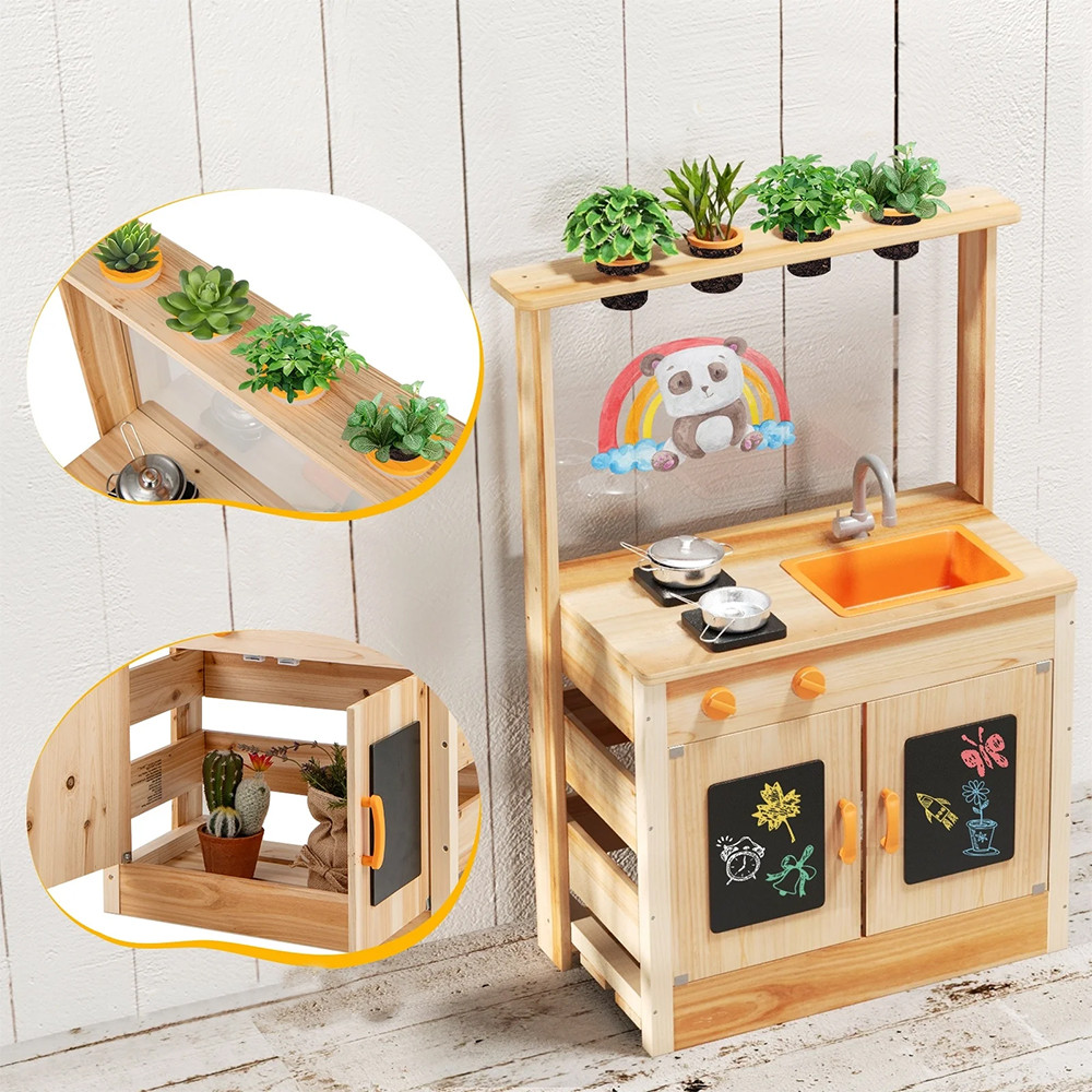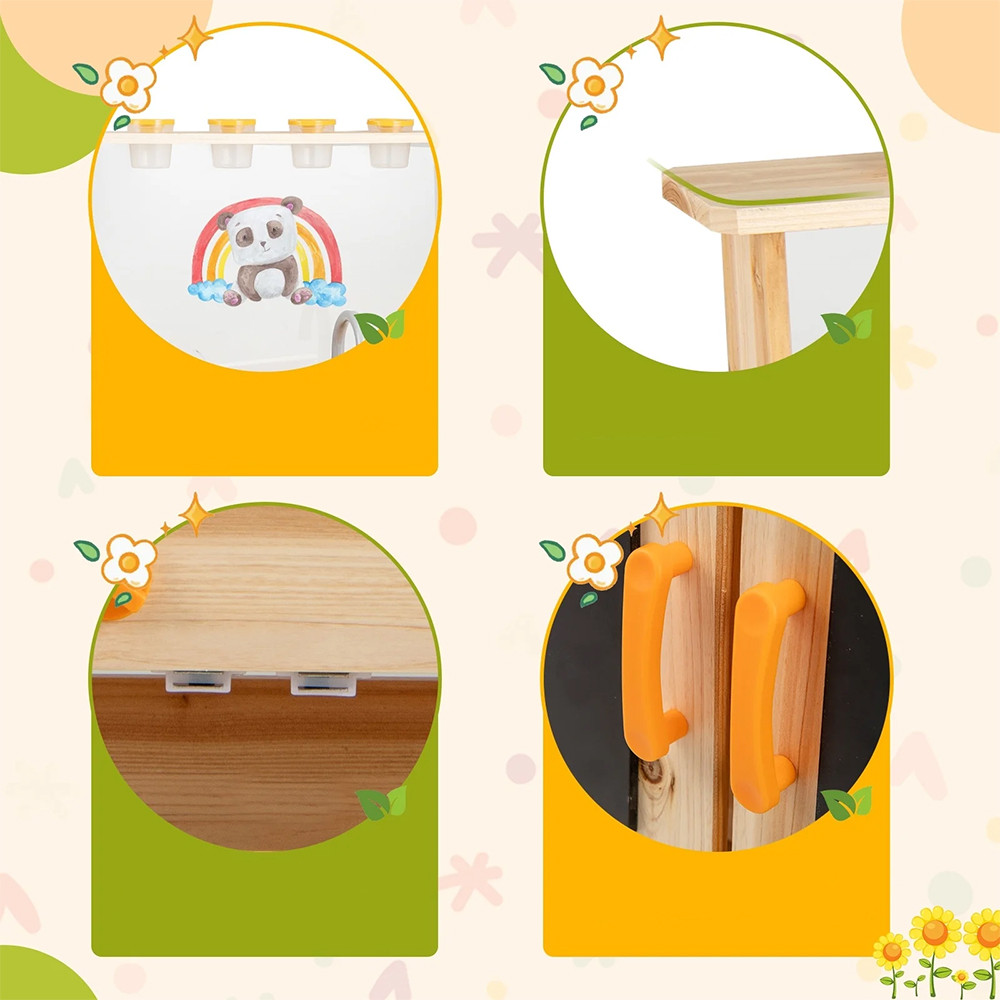 Vestavěné tabule na křídy s křídou a gumou poskytují příležitosti pro kreativní vyjádření: děti mohou kreslit, psát recepty nebo dokonce vést zahradní poznámky. Prostorná úložná skříň pomáhá udržovat nástroje a příslušenství organizované.