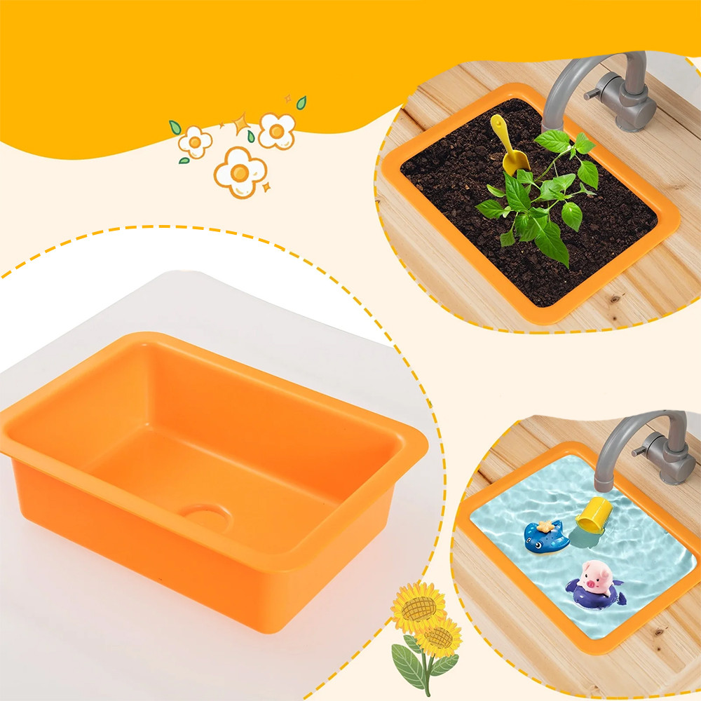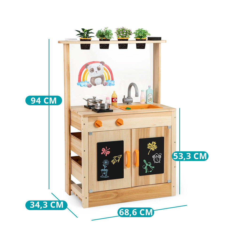 Tento dřevěný hrací stůl vyrobený z borovice nabízí ideální prostředí pro venkovní hraní. Realistické prvky – jako sporák, otočné knoflíky, dřez a kuchyňské náčiní – umožňují dětem ponořit se do hraní rolí, zatímco rozvíjejí své jemné motorické dovednosti a představivost.