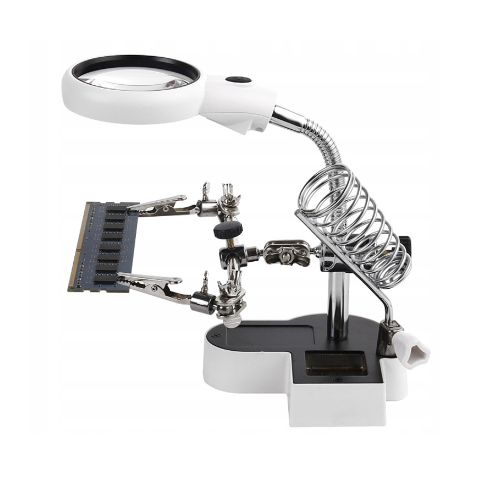 Nastavitelné kovové svorky „třetí ruky“ pevně uchopí součástky, zatímco obě vaše ruce zůstanou volné pro práci. Ohebný rameno s lupou lze snadno nastavit do požadované polohy. Integrovaný spirálový držák na páječku se postará o bezpečné a praktické odložení nástroje během práce.