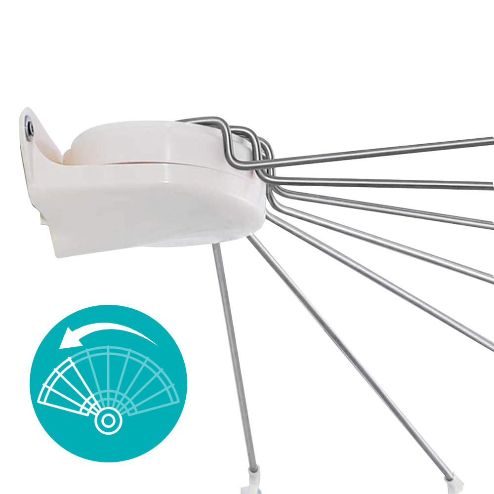 Tento deštníkový držák na sprchový závěs je ideální pro menší koupelny, kde je efektivní využití prostoru klíčové. Otočná tyč umožňuje snadné odklopení, když se nepoužívá, takže v koupelně nepřekáží.