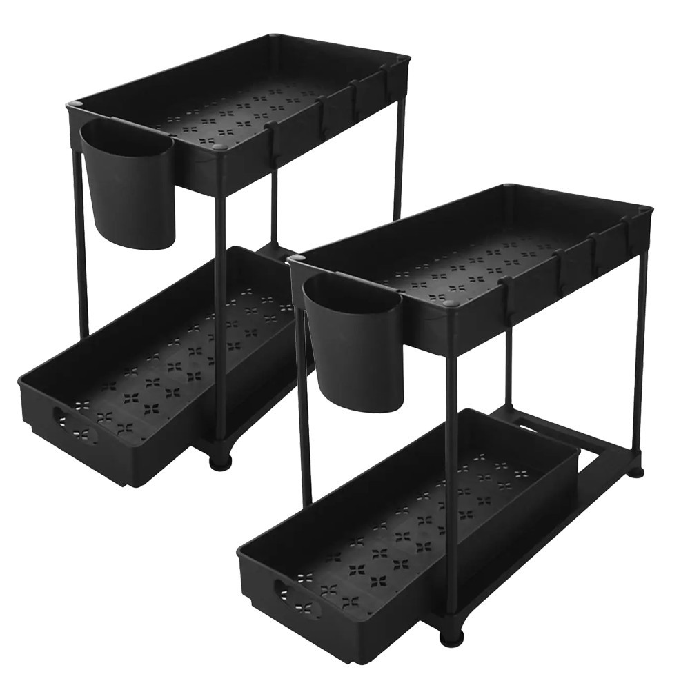 Dvouúrovňový organizér je ideálním řešením tam, kde je málo místa a hodně věcí k uskladnění. Umístěte ho pod dřez nebo na polici – prakticky uspořádá nádobí, čisticí prostředky nebo koupelnové doplňky.