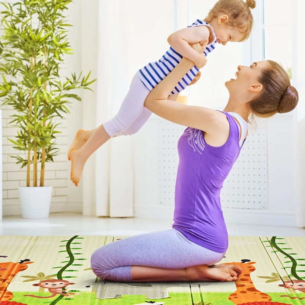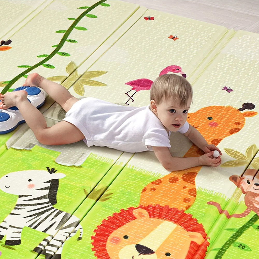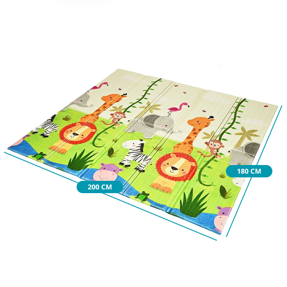 Hrací podložka o rozměrech 200 × 180 cm nabízí dostatek prostoru, kde si vaše miminko může volně plazit, šplhat a hrát. 1,4 cm silná pěnová vrstva účinně tlumí pády a chrání kolena a lokty.