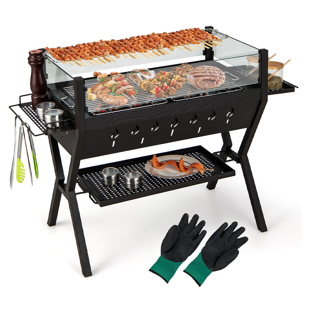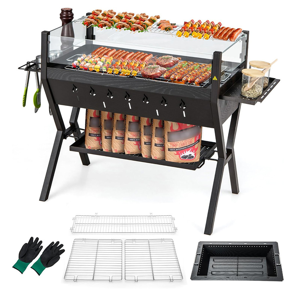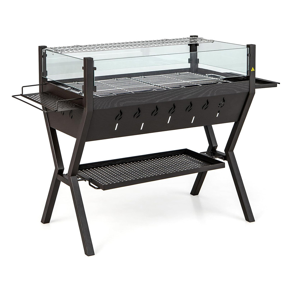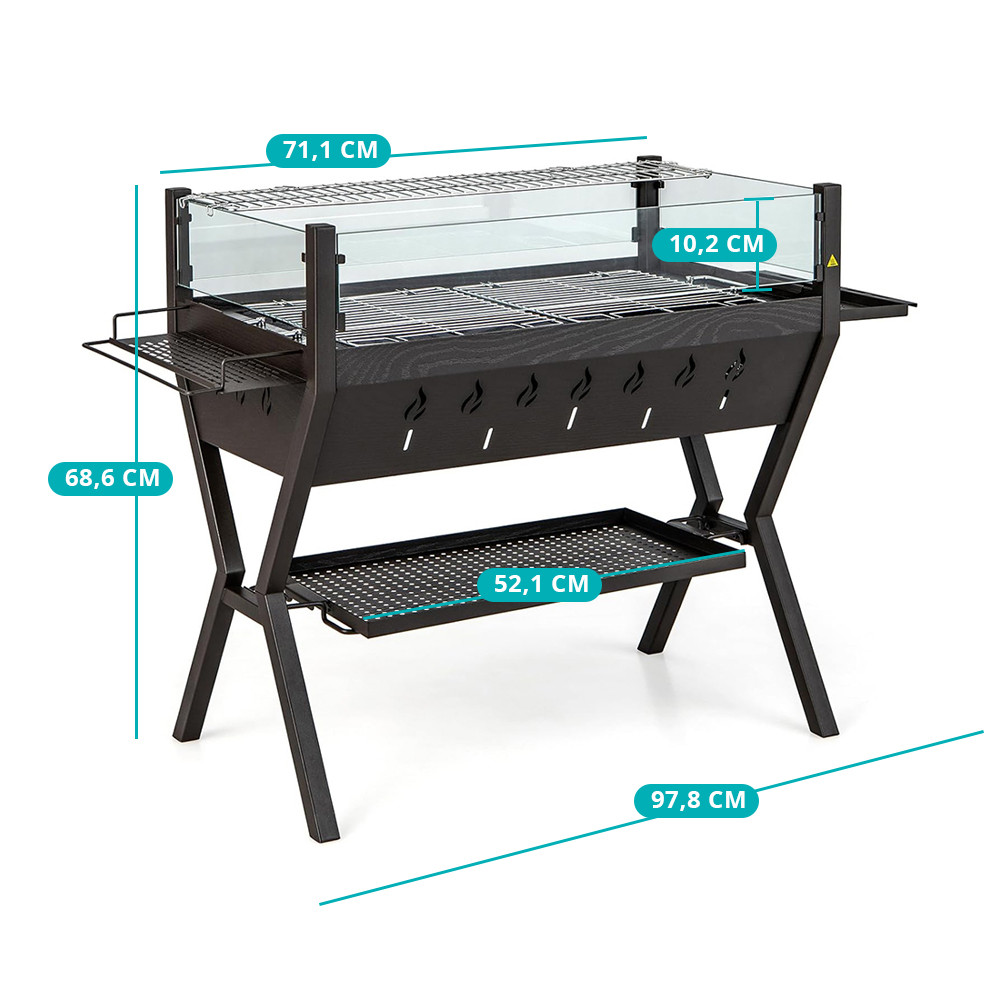 Boční držáky na koření, spodní úložný rošt a snadno uchopitelné rukojeti pomáhají udržet pořádek při grilování, zatímco stabilní rám zajišťuje bezpečné používání.