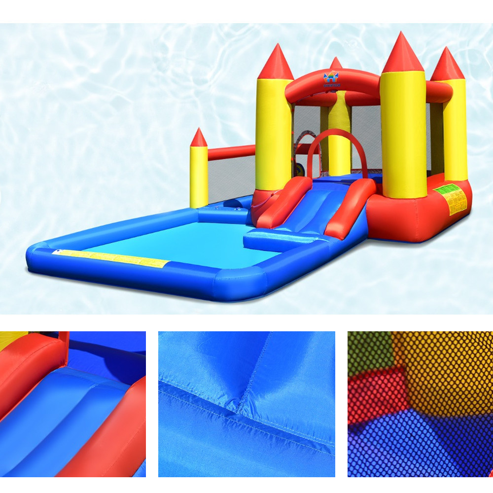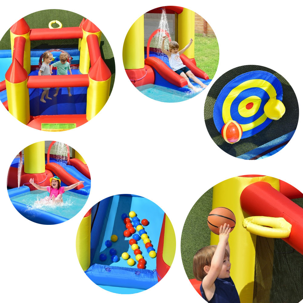 Skákací hrad nabízí šest různých herních prvků – obrovskou klouzačku, skákací plochu, vodní bazén, míčkový bazén, cílové házení a basketbalový koš – což zajišťuje rozmanitou zábavu. Ať už sami nebo s přáteli, děti mohou zažívat nová dobrodružství pokaždé.