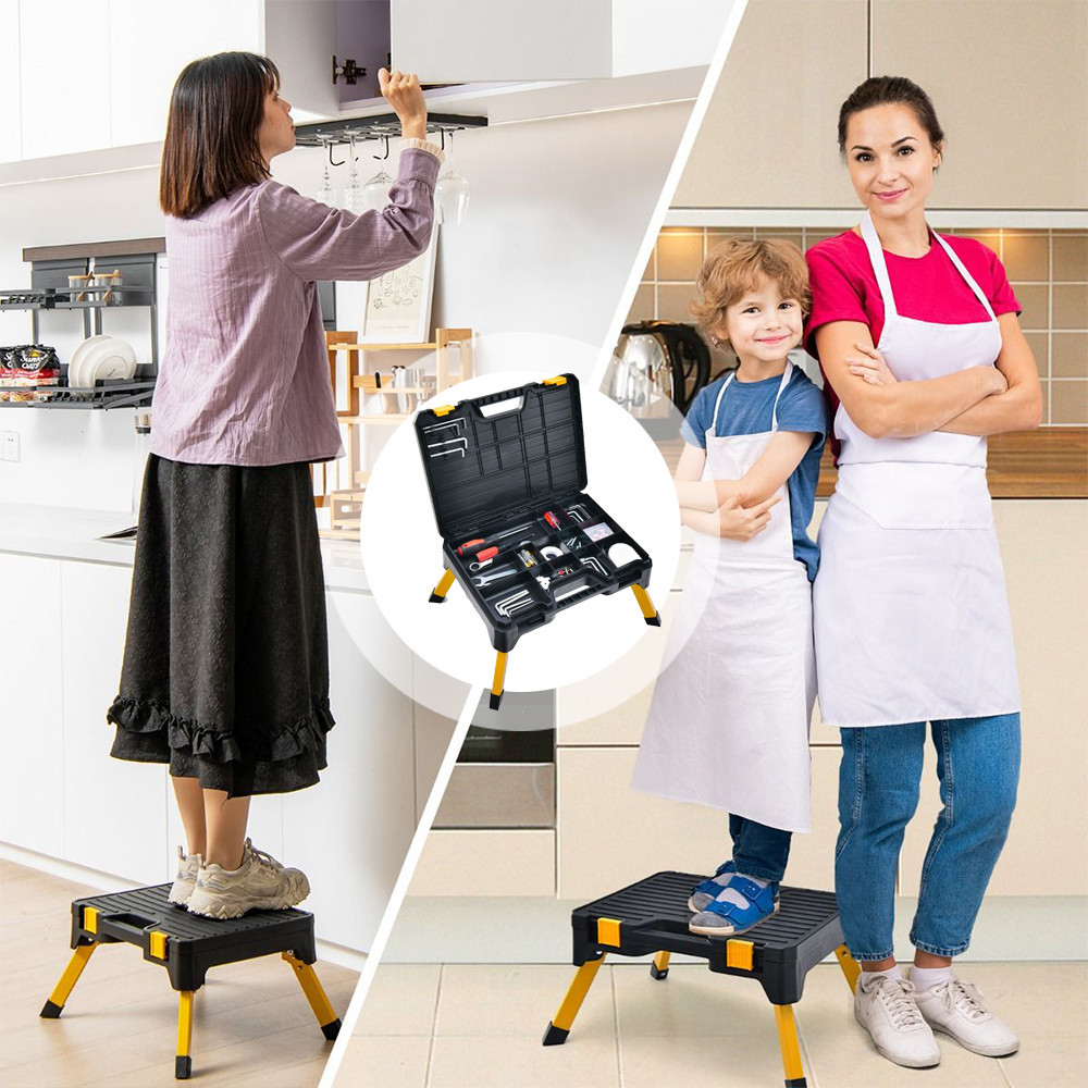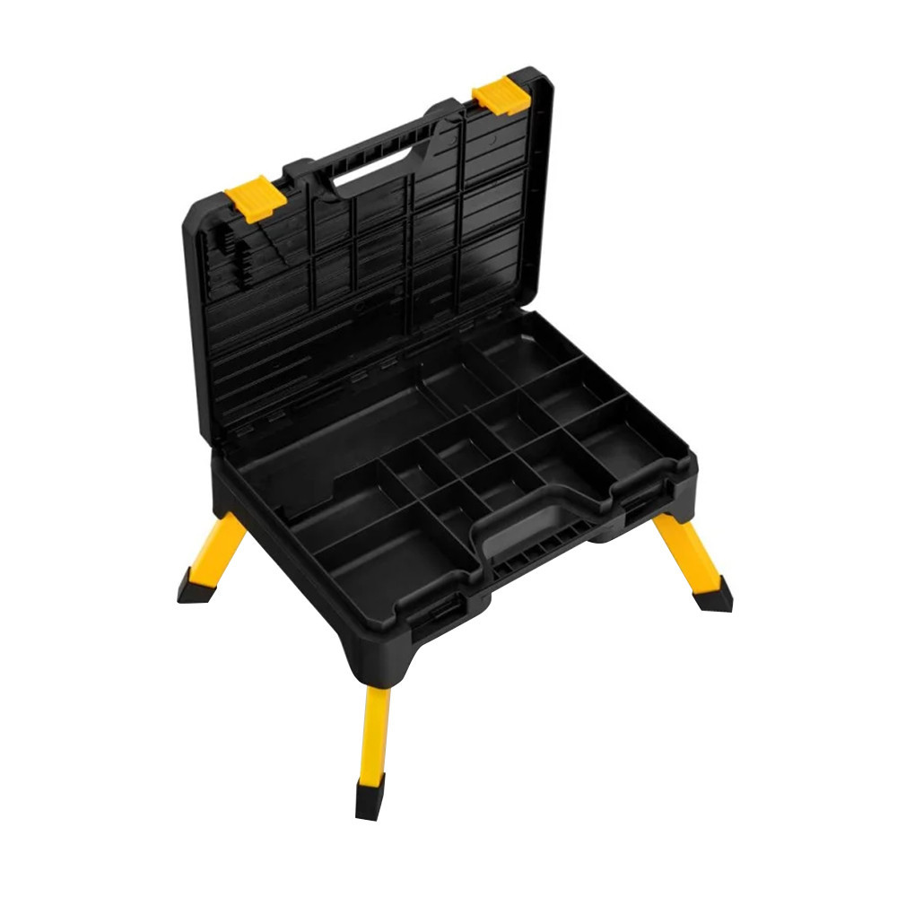 Schůdek se snadno přemění na úložnou jednotku na nářadí: lze jej otevřít jedním pohybem a uvolněním zámku získáte přístup k vnitřním úložným přihrádkám. Interiér nabízí 12 různě velkých přihrádek, zatímco na straně víka se nachází dalších 7 slotů pro extra úložný prostor. Tímto způsobem můžete mít všechny své nástroje organizované a na dosah.