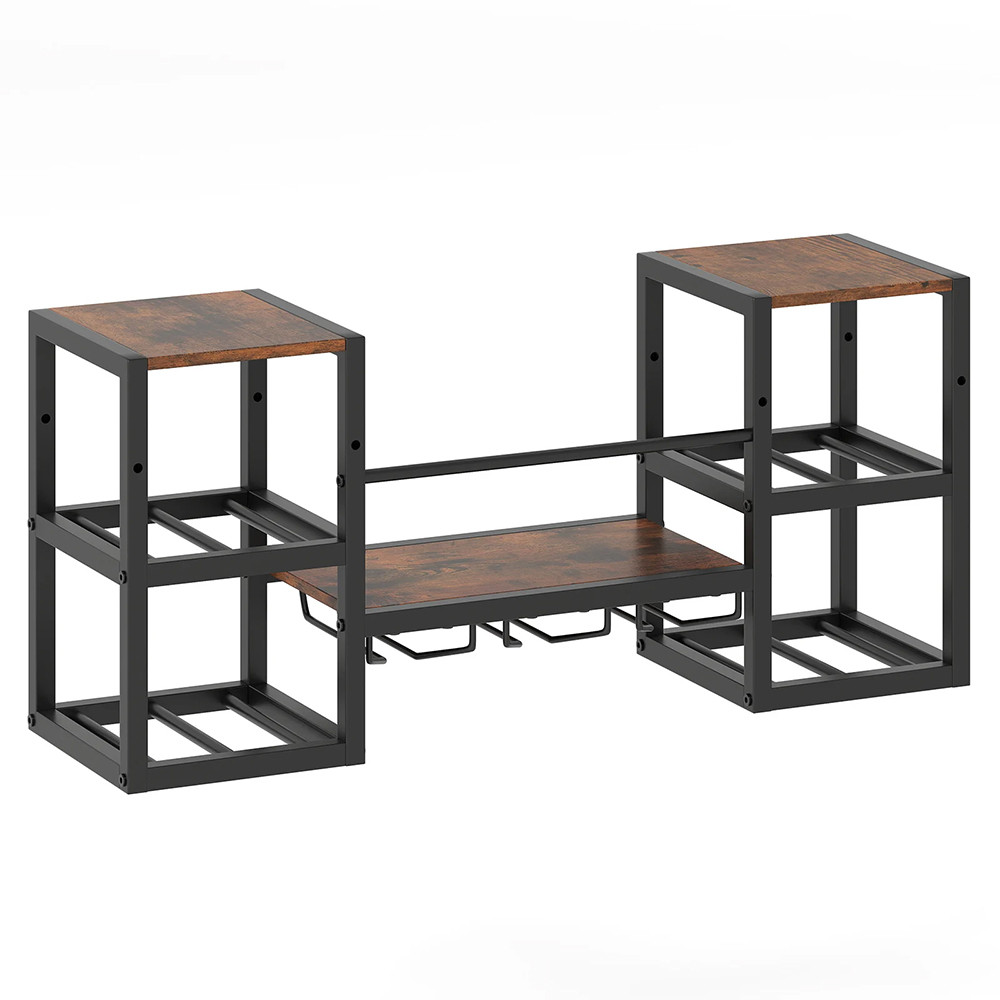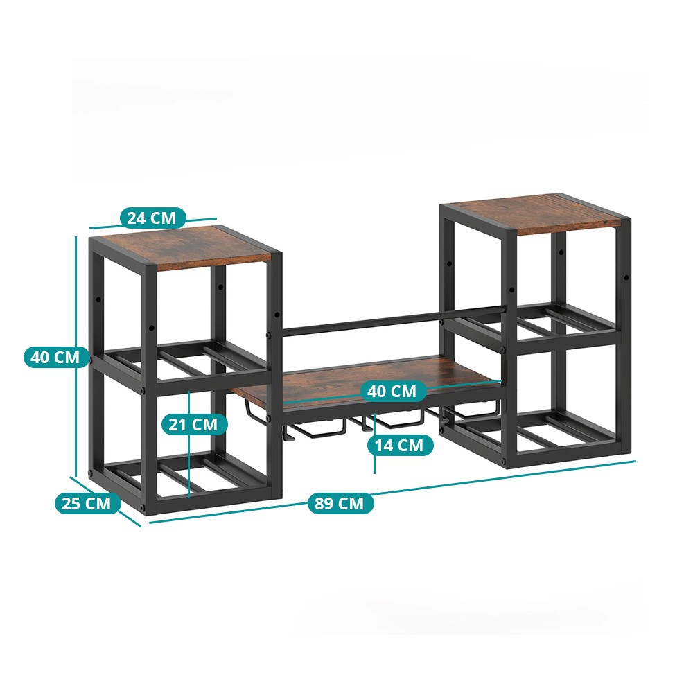 Černý kovový rám a rustikální hnědé police vytvářejí jednoduchou a útulnou atmosféru. Nenápadný design pěkně vyplňuje prostor, ať už v kuchyni, obýváku nebo jídelně.