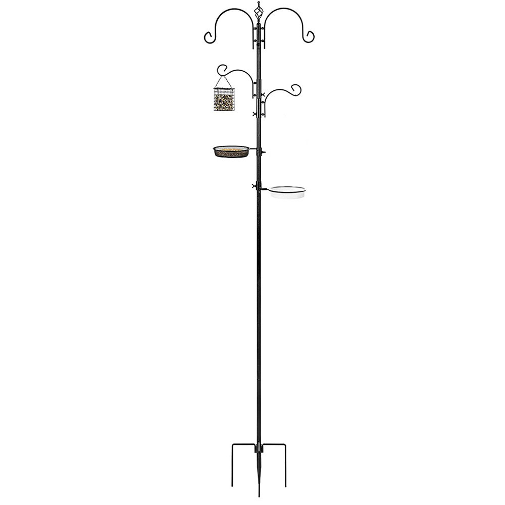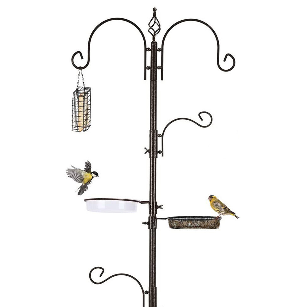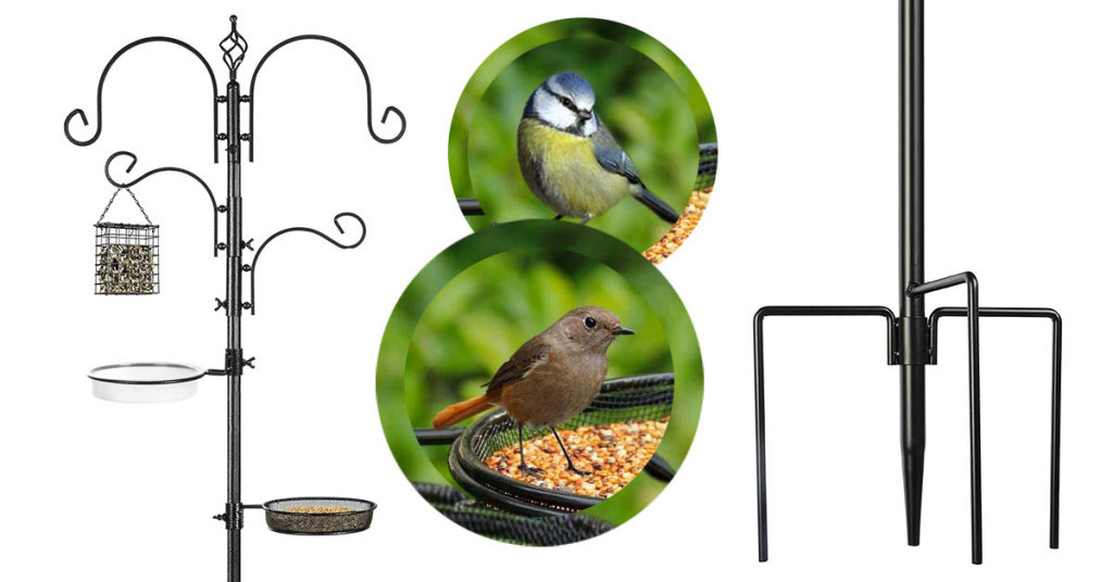 Kovová konstrukce je pevná a trvanlivá, odolává povětrnostním vlivům a dlouhodobě zajišťuje komfort pro ptáky i estetickou hodnotu vaší zahrady. Stabilní zapichovací tyč pevně drží krmítko v zemi, i za větrného počasí. Misky a háčky jsou rozmístěny tak, aby ptáci měli pohodlný přístup ke krmivu.