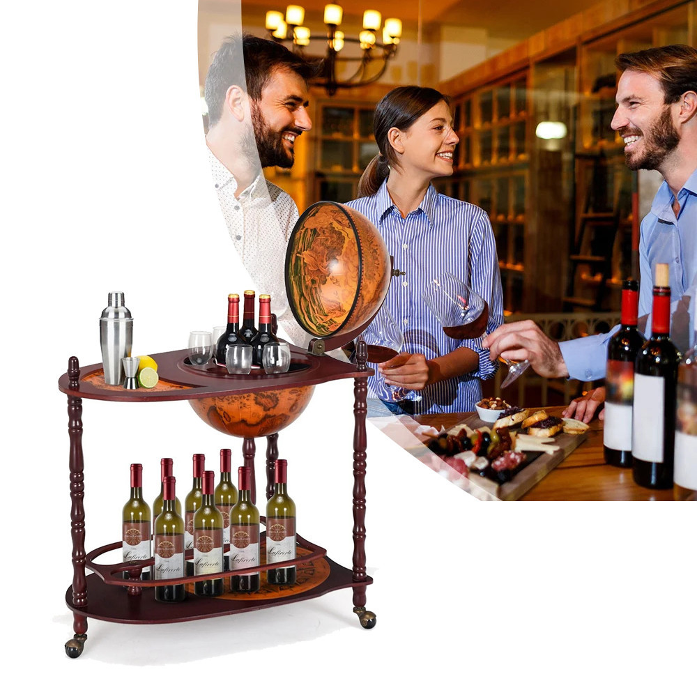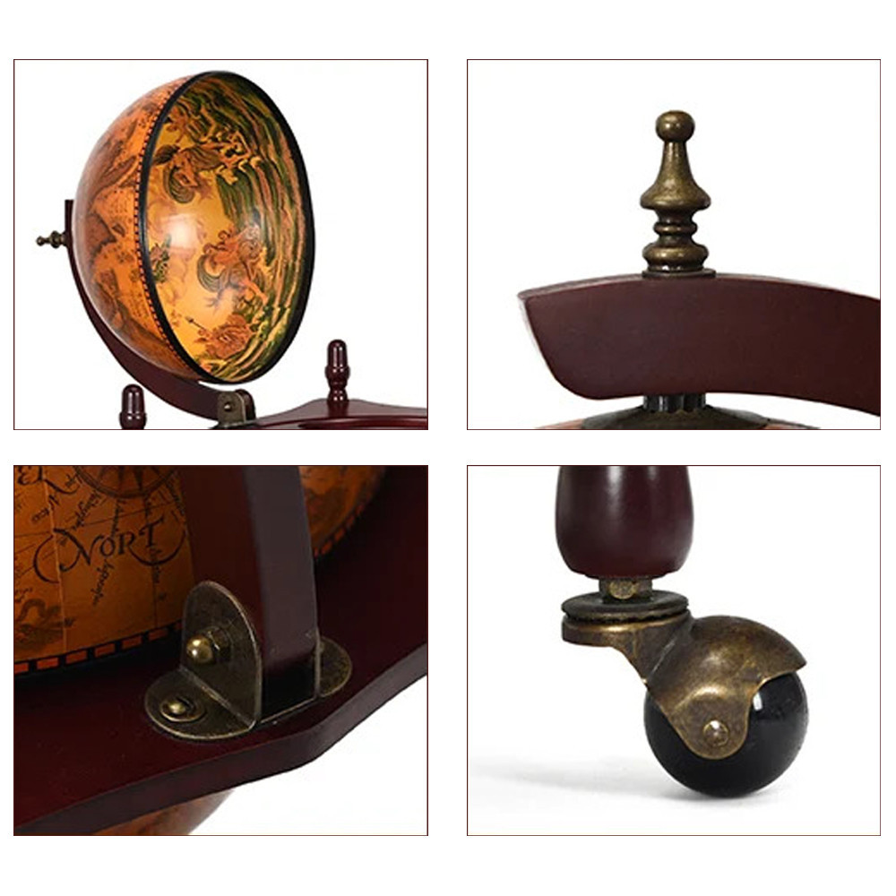 Vnější strana globu je zdobena klasickým mapovým vzorem, což z něj činí jak dekorativní, tak funkční prvek. Interiér je skutečným překvapením: organizované úložiště pro láhve vína a sklenice, vše v stylovém provedení. Kousek nábytku, který ohromí každého hosta.