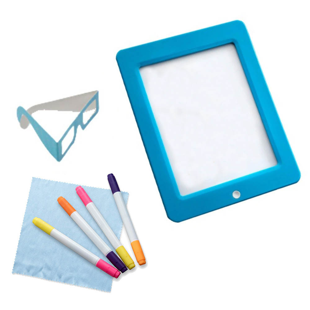 Speciální 3D brýle dodají kresbám nový rozměr – jako by ses ocitl přímo uprostřed svého vlastního světa fantazie! Hotové obrázky si navíc můžeš vystavit na stěně pomocí přísavkového držáku a proměnit tak pokojíček v malou galerii.