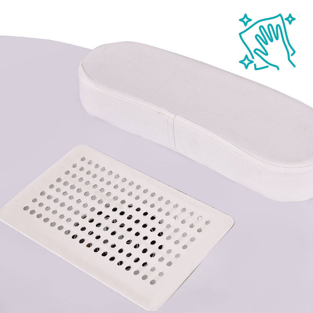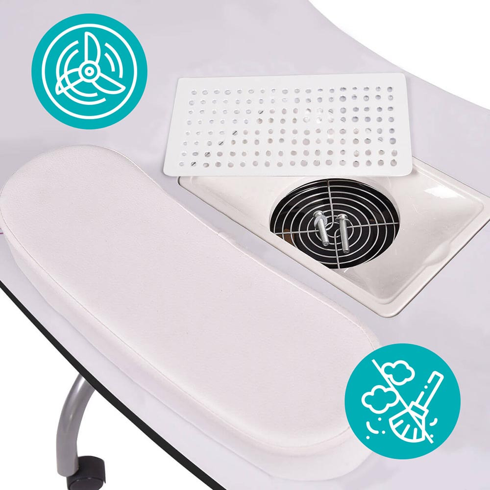Manikúrní stůl s vestavěným ventilátorem účinně odsává prach při pilování, čímž zajišťuje hygienické podmínky – ať už v salonu, nebo při domácích návštěvách.