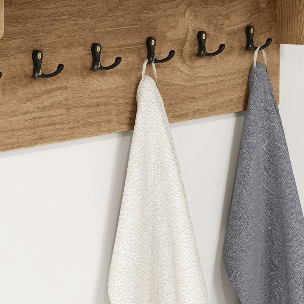 Pevná dřevěná konstrukce zajišťuje dlouhou životnost, zatímco předvrtané otvory a přiložený montážní materiál umožňují rychlou a bezproblémovou instalaci. Hladké háčky bez ostrých hran chrání vaše oblečení a zaručují bezpečné používání.