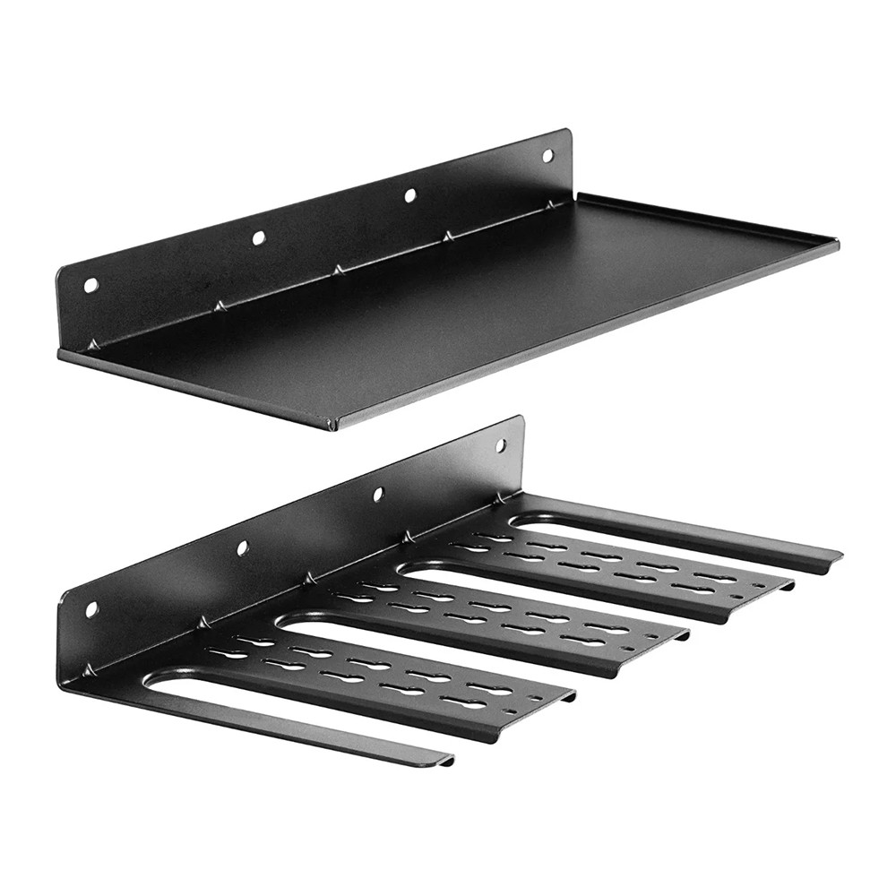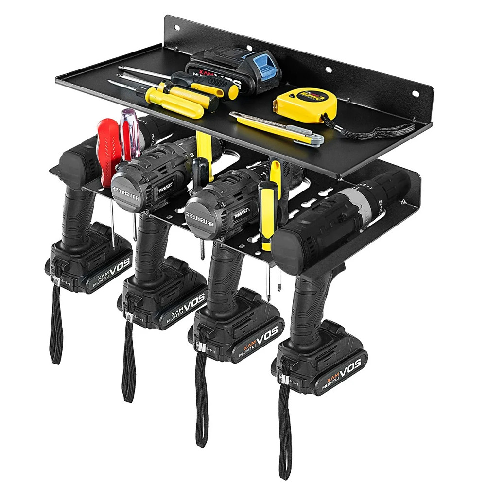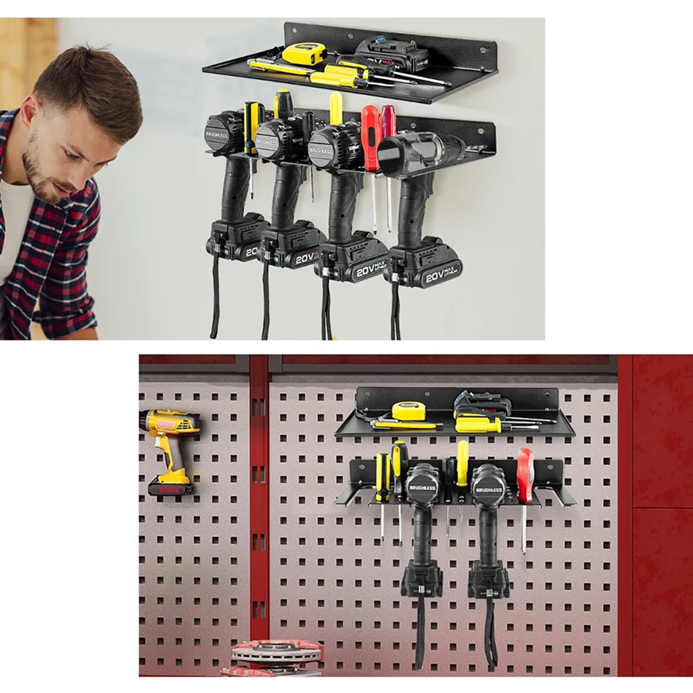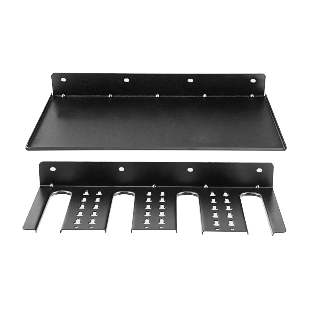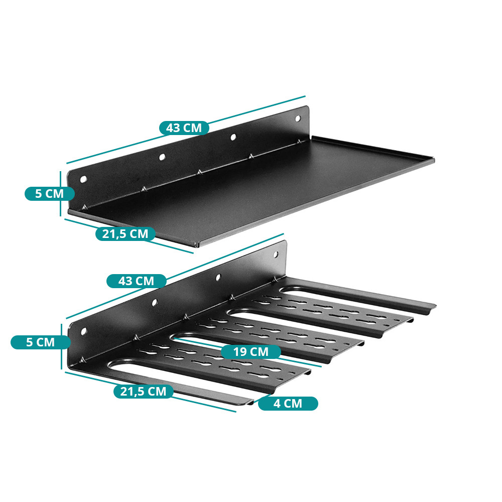 Stojan se skládá ze dvou samostatných částí, takže polici a držák na vrtačku můžete namontovat v libovolné vzdálenosti a pořadí podle vašeho zvyku a stěny. Montážní otvory usnadňují instalaci a sada hmoždinek umožňuje bezpečné připevnění na různé typy stěn.