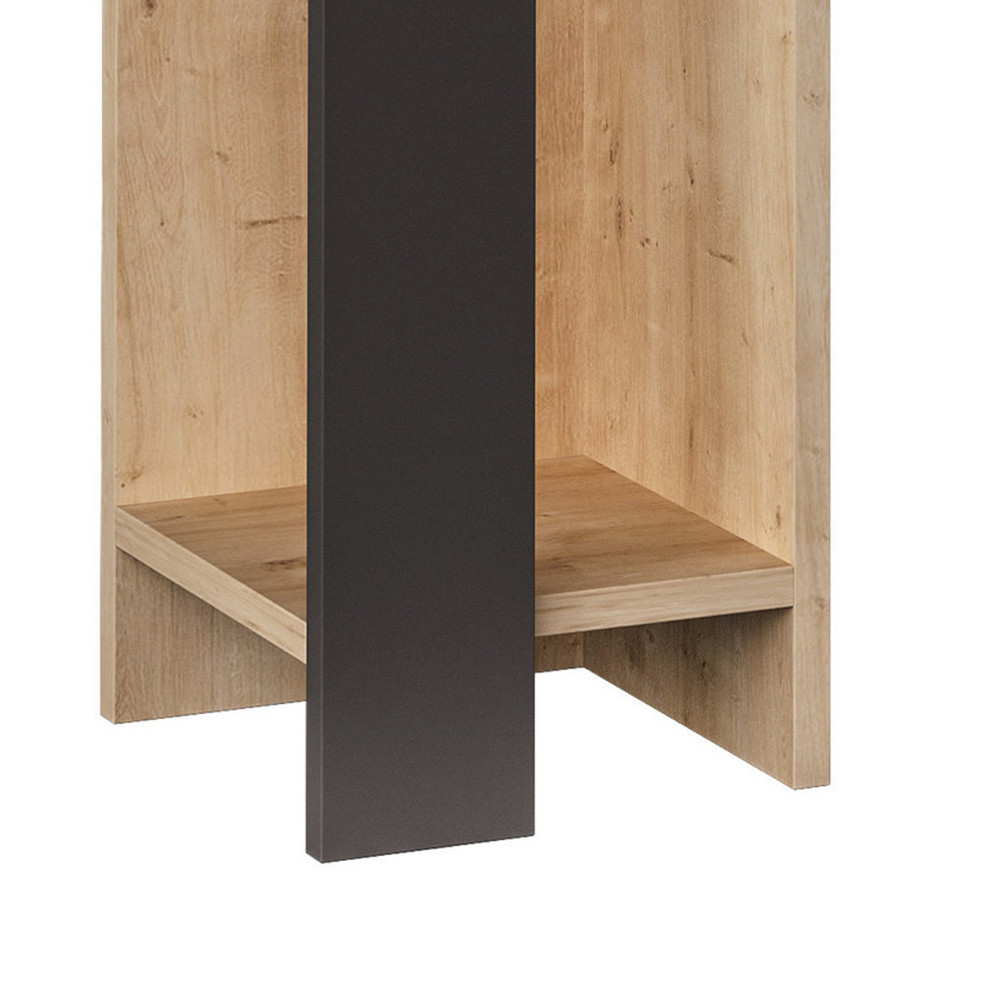 Přirozený dubový efekt a antracitový prvek poskytují elegantní kontrast v místnosti.