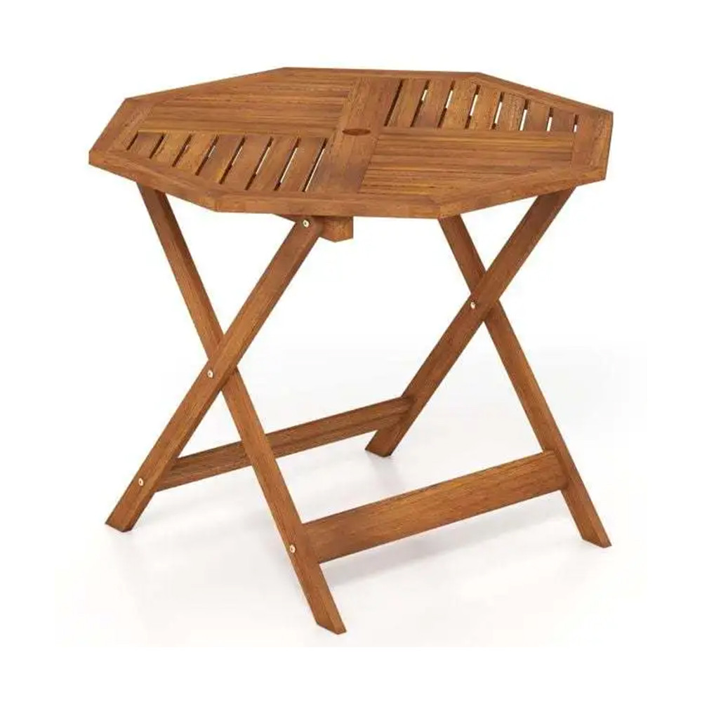 Lamelový stůl zabraňuje hromadění prachu a drobků a usnadňuje čištění. Uprostřed je otvor pro slunečník, který poskytuje stín. Nedoporučuje se vystavovat přímo dešti, aby stůl dlouho vydržel krásný.