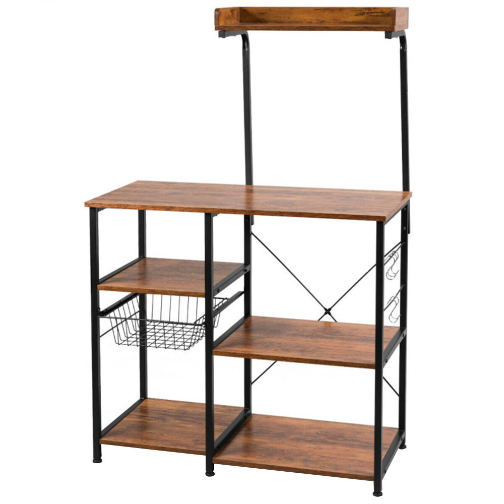 Stojan s tmavě hnědými policemi a robustním kovovým rámem poskytuje stylový a využitelný prostor pro kuchyňské potřeby. Snadno na něj uložíš menší spotřebiče, hrnce či suroviny.