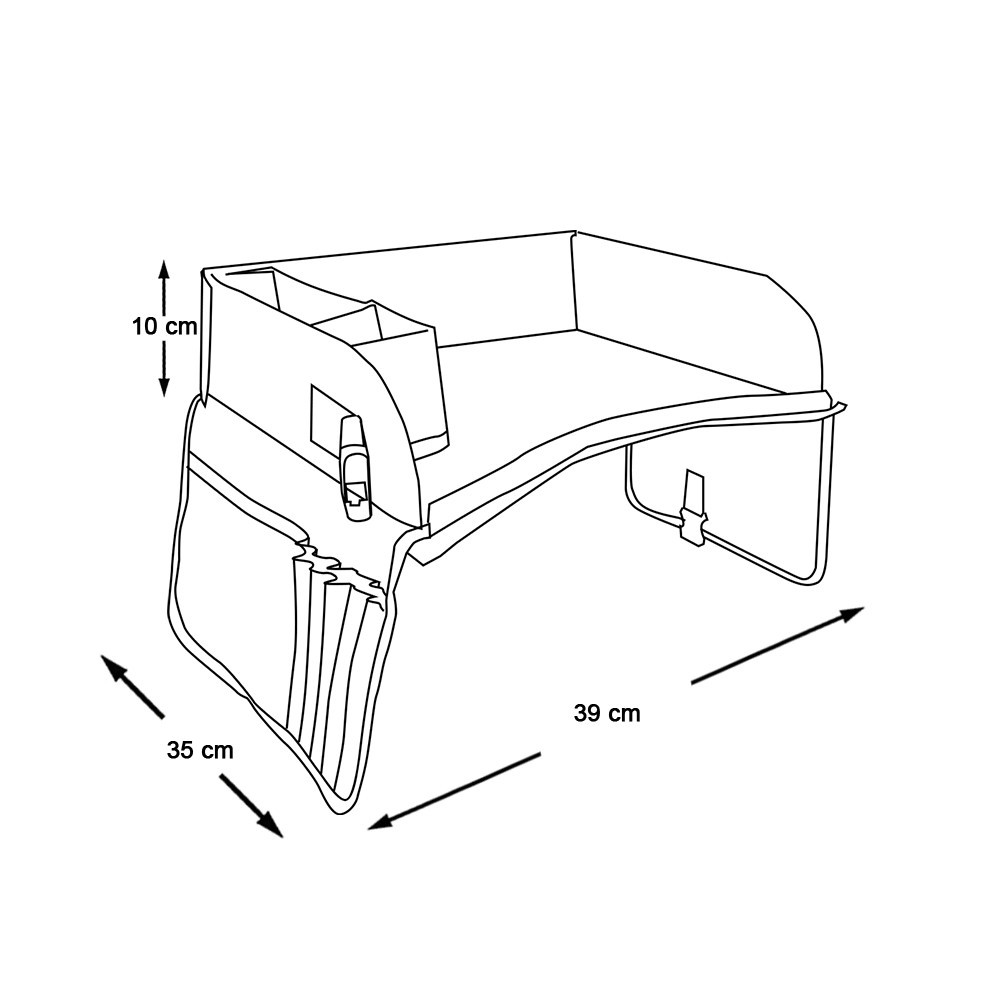Stolek je vybaven mnoha úložnými kapsami, do kterých lze snadno uložit menší předměty, jako jsou karty, pastelky nebo svačiny. Držáky na nápoje bezpečně zajistí dětské nápoje, aby se během cesty nevylily. Díky univerzálnímu designu lze stolek používat v autě, letadle nebo vlaku.