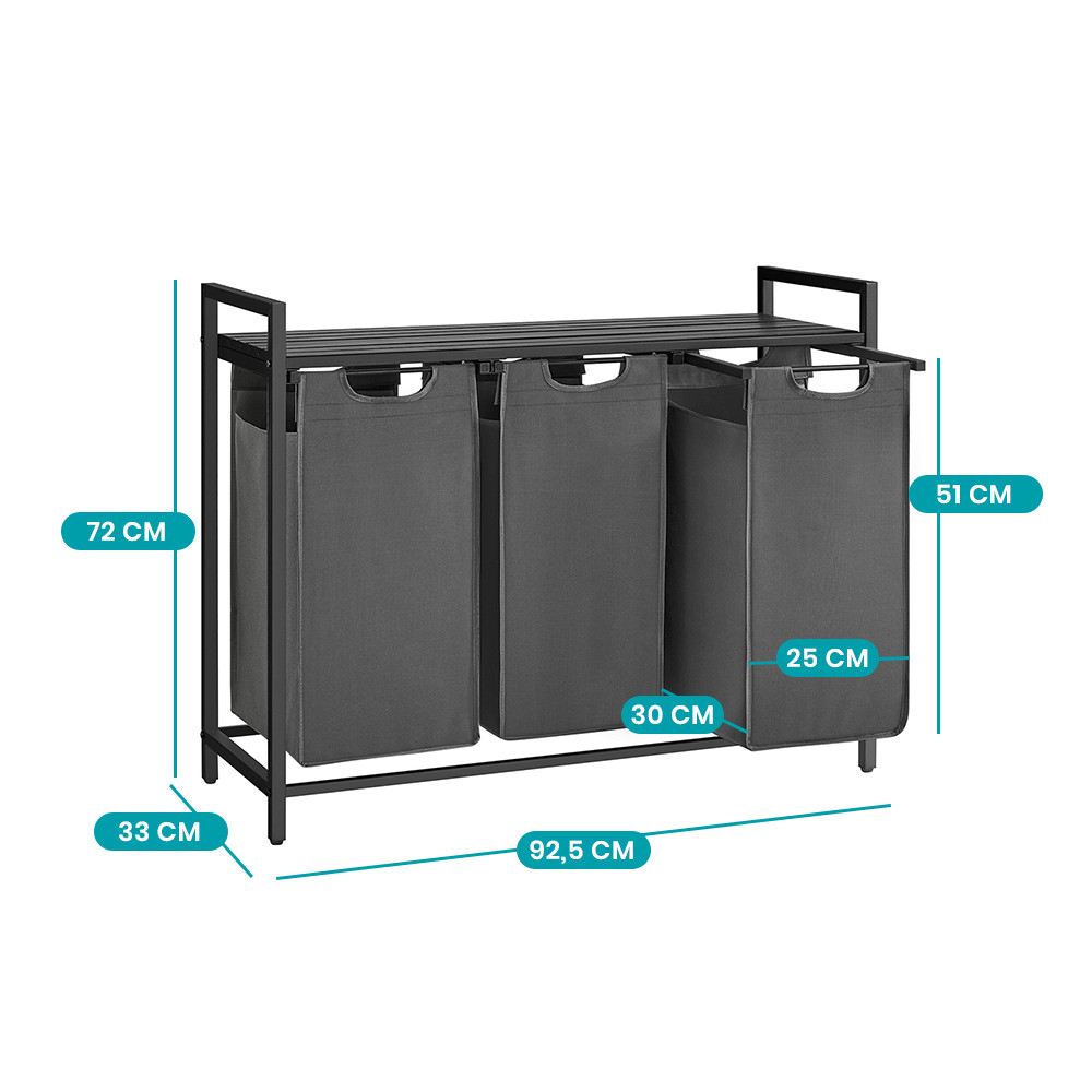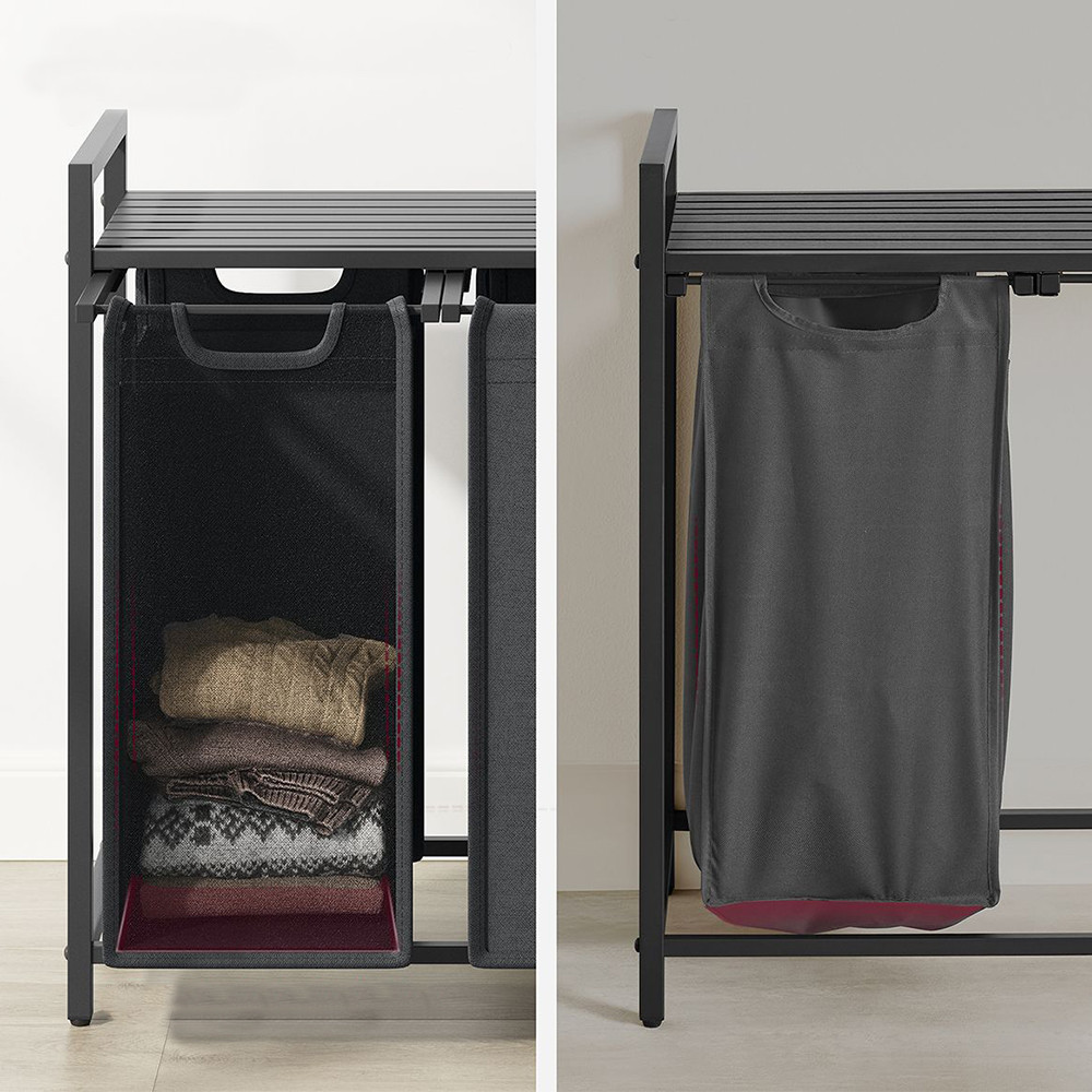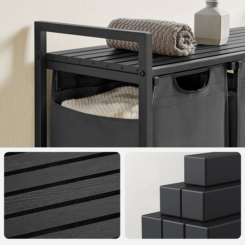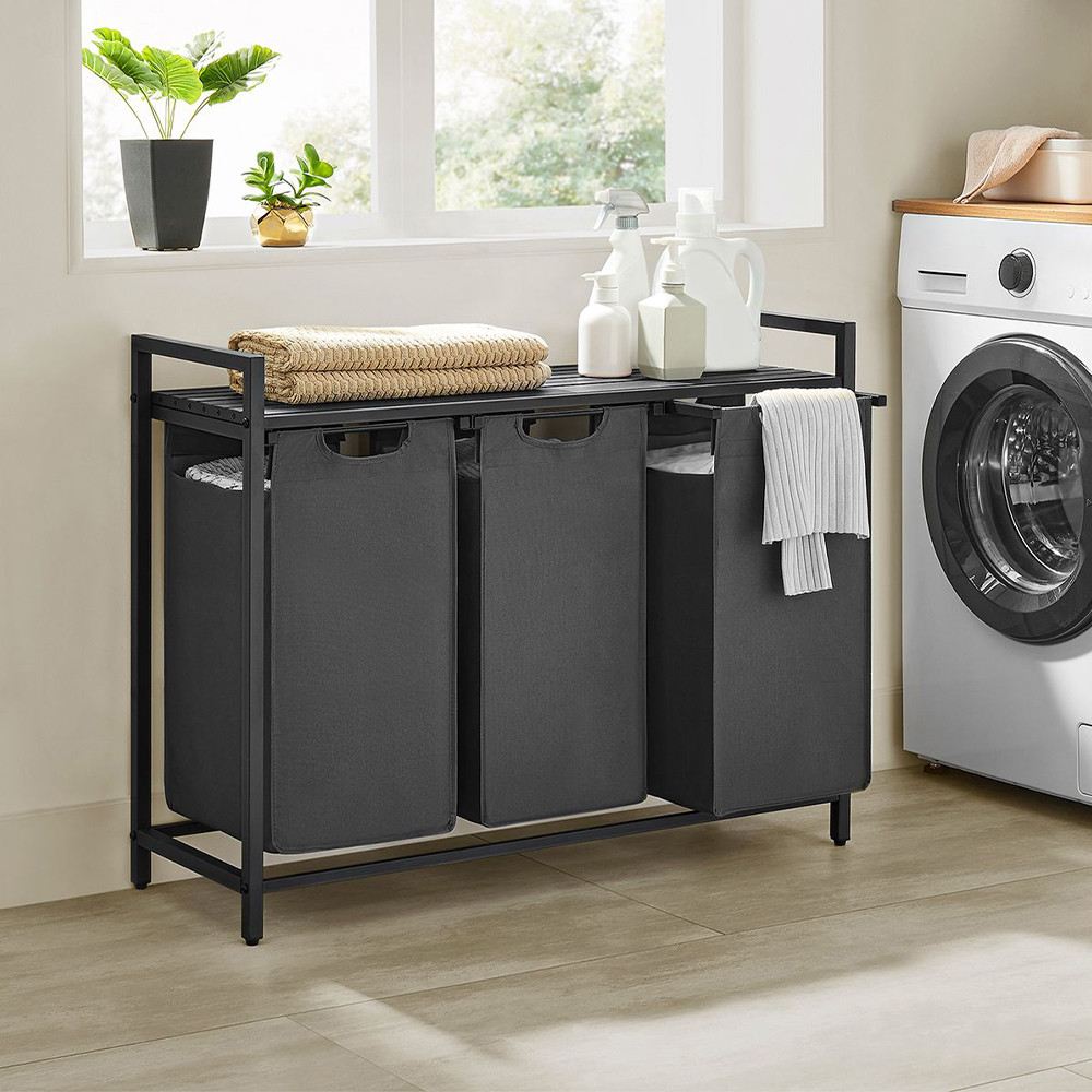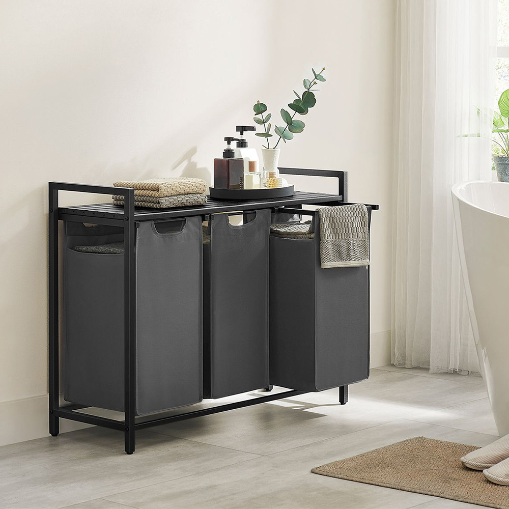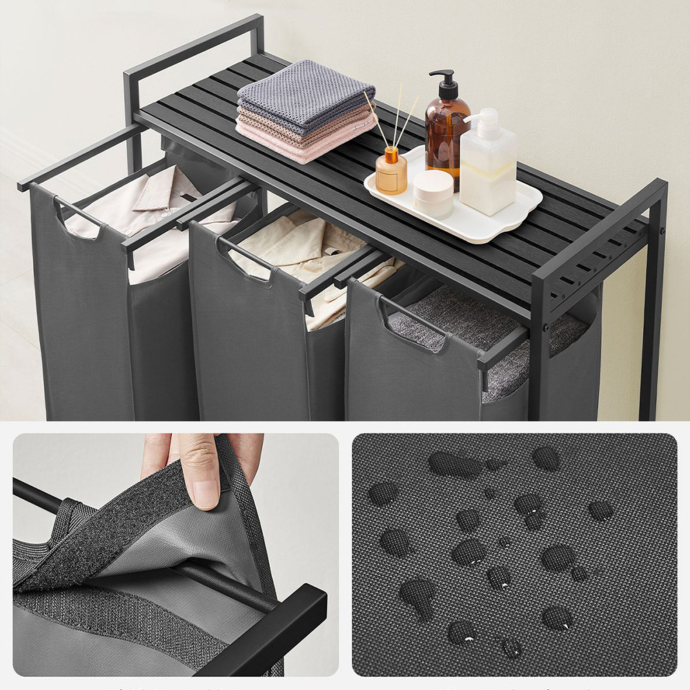 Koš na prádlo s kapacitou 114 litrů nabízí tři přihrádky, z nichž každá má kapacitu 38 litrů, což vám umožňuje snadno oddělit světlé, tmavé a barevné oblečení. Tašky jsou odnímatelné, lze je přepravovat samostatně a jsou vyztuženy plastovými výztuhami, aby si udržely svůj tvar.