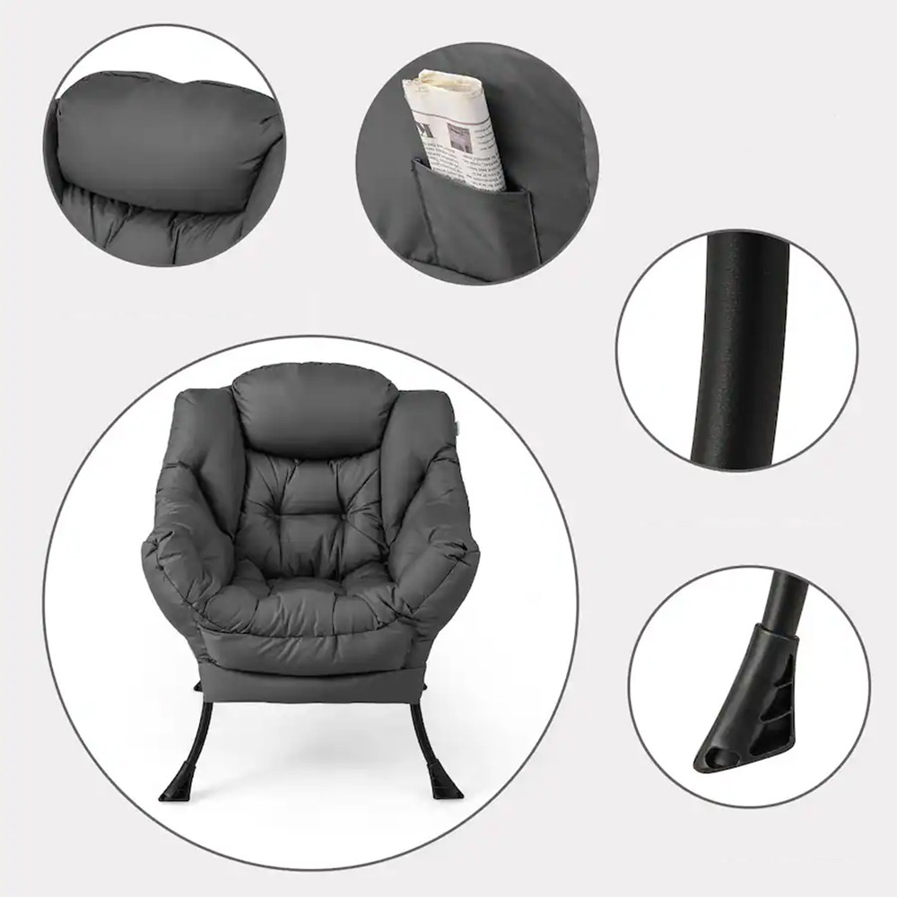 Tmavě šedý potah se snadno hodí do většiny interiérů a dodává prostoru klidnou, uklidňující atmosféru. Kovové nohy dodávají lehčí vzhled, zatímco celkový dojem křesla zůstává přátelský a lákavý.