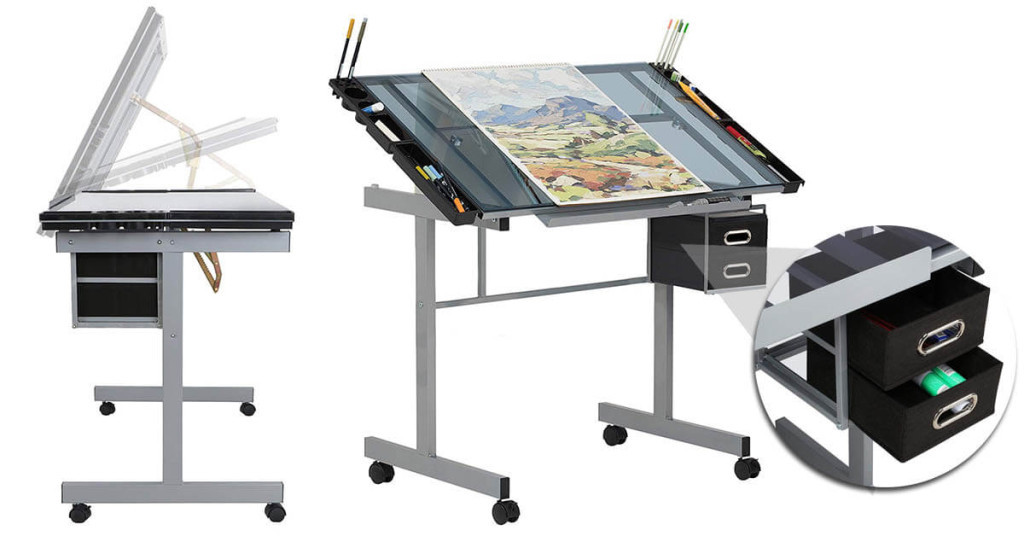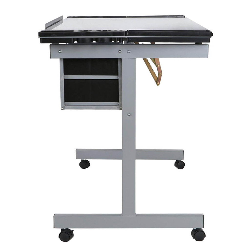 Stůl je vybaven bočními úložnými přihrádkami a dvěma prostornými zásuvkami, takže všechny potřebné nástroje – tužky, pravítka, štětce – budete mít vždy po ruce. Praktické uspořádání pomáhá udržovat pořádek během práce.