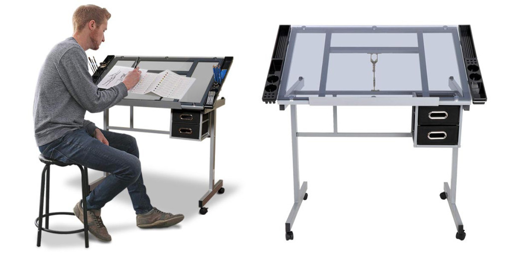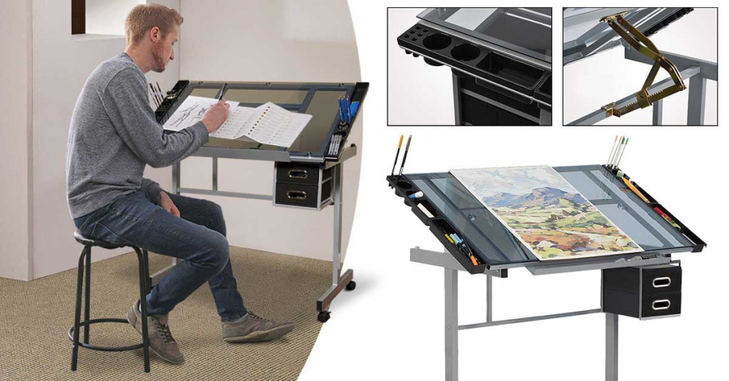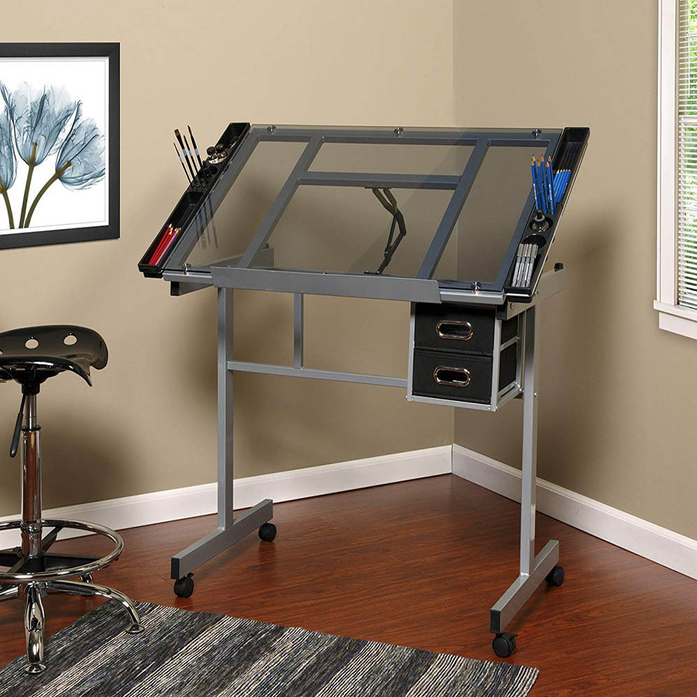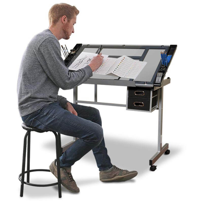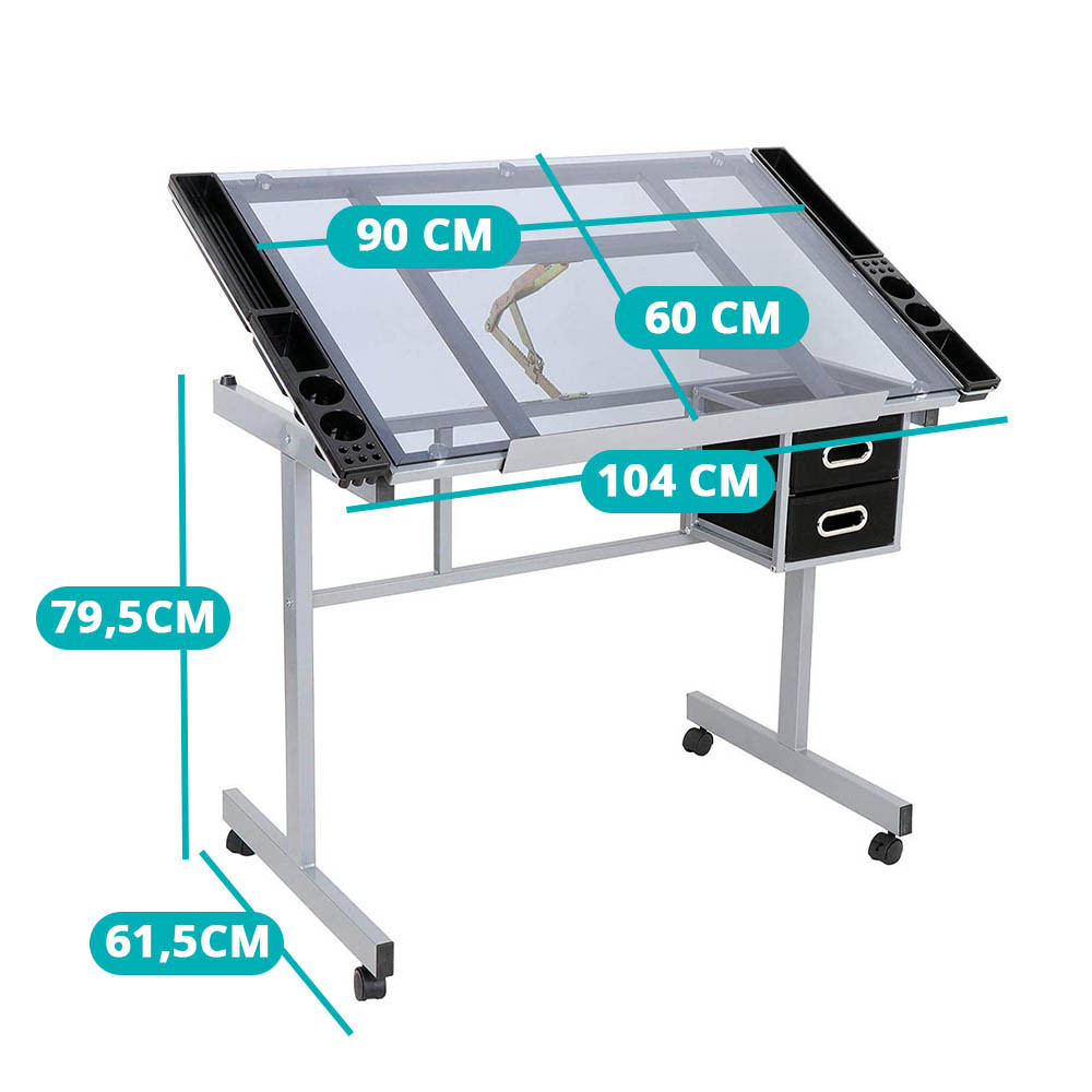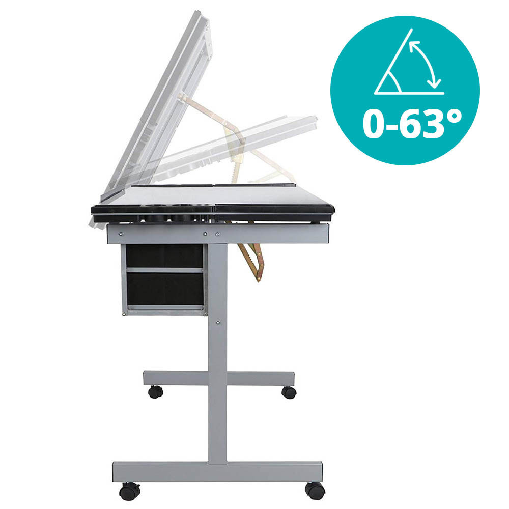 Desku lze naklopit v rozsahu 0–63°, takže si snadno nastavíte nejpohodlnější úhel pro práci. Skleněná deska umožňuje podsvícení (světlo není součástí balení), což je ideální pro technické výkresy, grafické návrhy a další precizní práce.