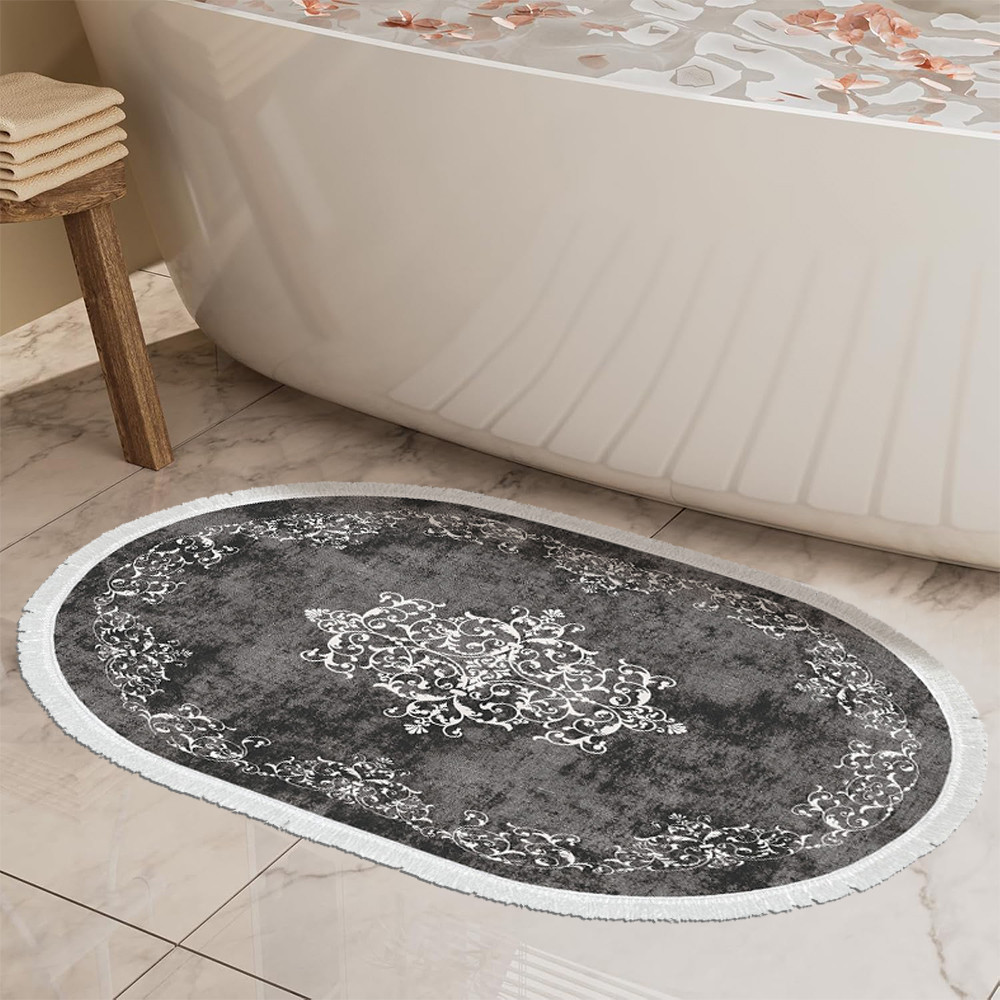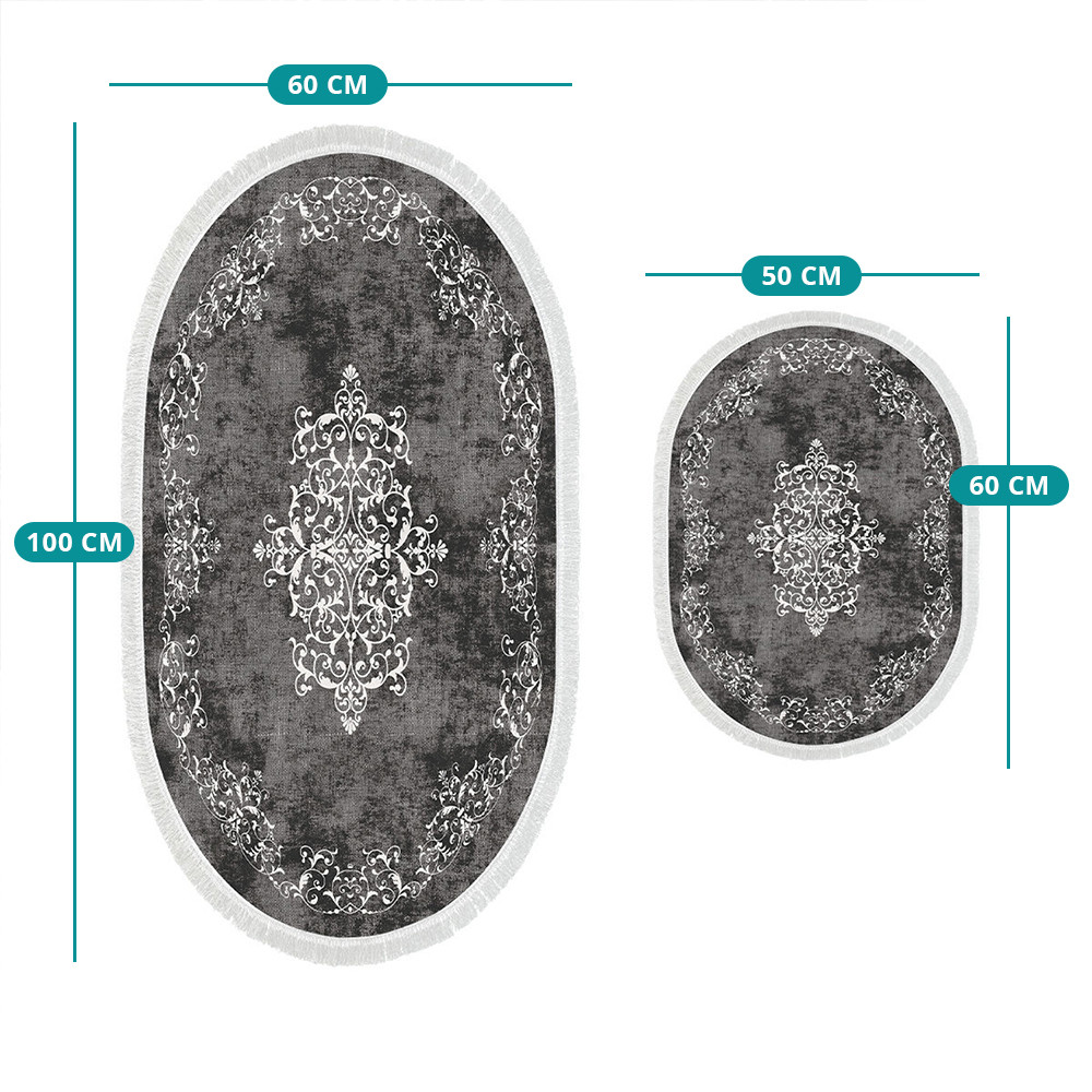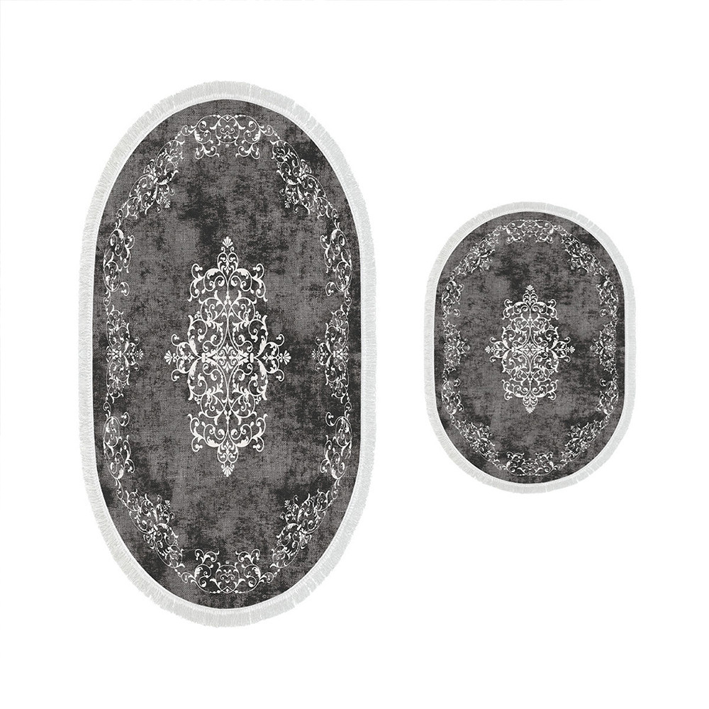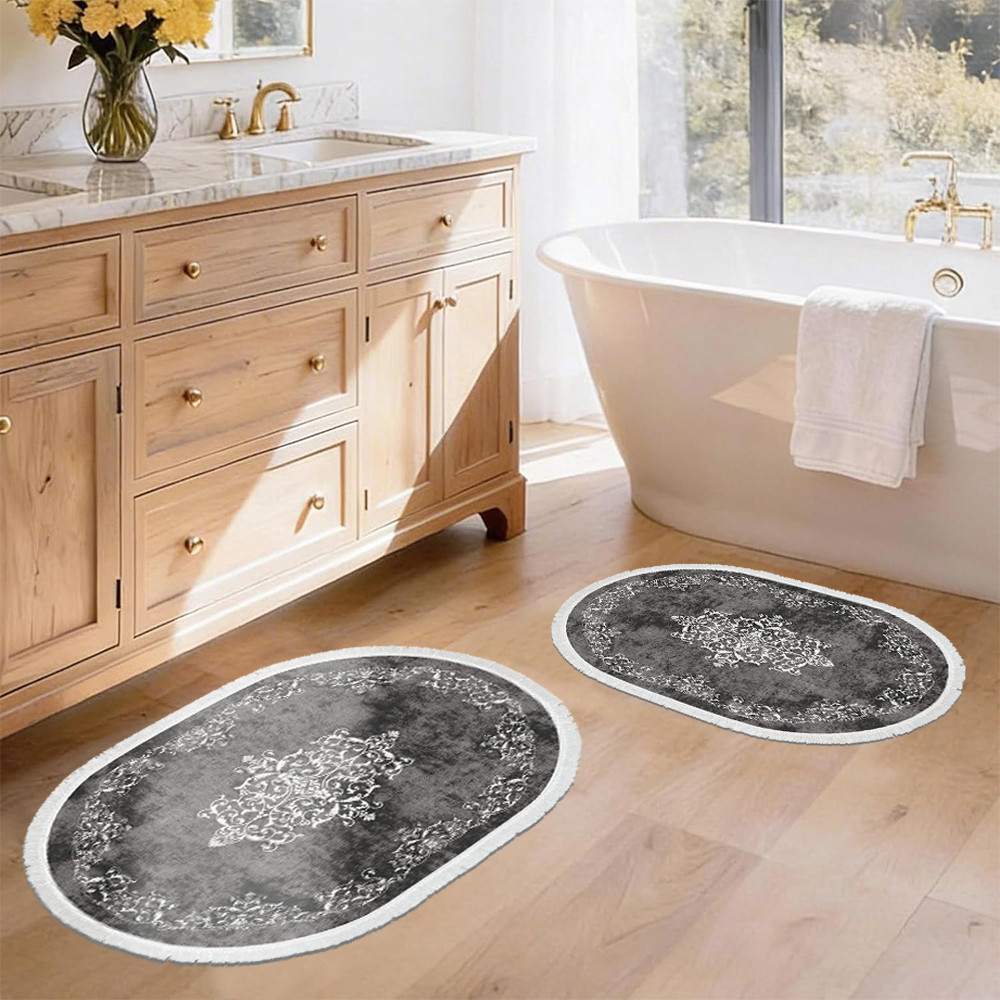 Šedý odstín a klasický vzor vytvářejí harmonickou, klidnou atmosféru. Dva koberce v různých velikostech se perfektně hodí před umyvadlo a vanu nebo sprchu.