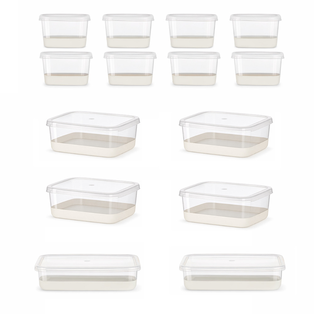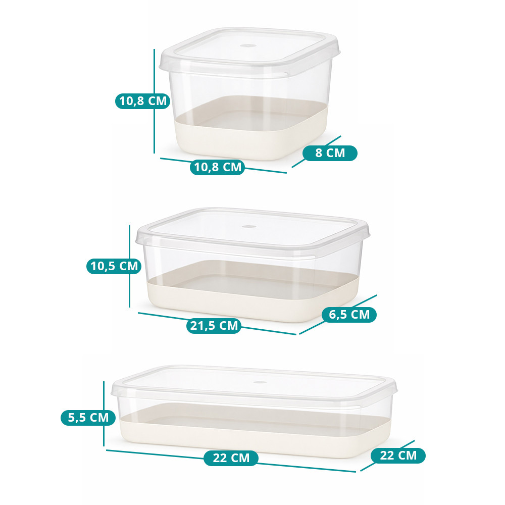 Krabičky různých objemů jsou ideální pro uchovávání zeleniny, ovoce, masa nebo zbytků. Dobře těsnící víčka pomáhají udržet vaše potraviny čerstvé a umožňují úsporné skladování na vašich policích.