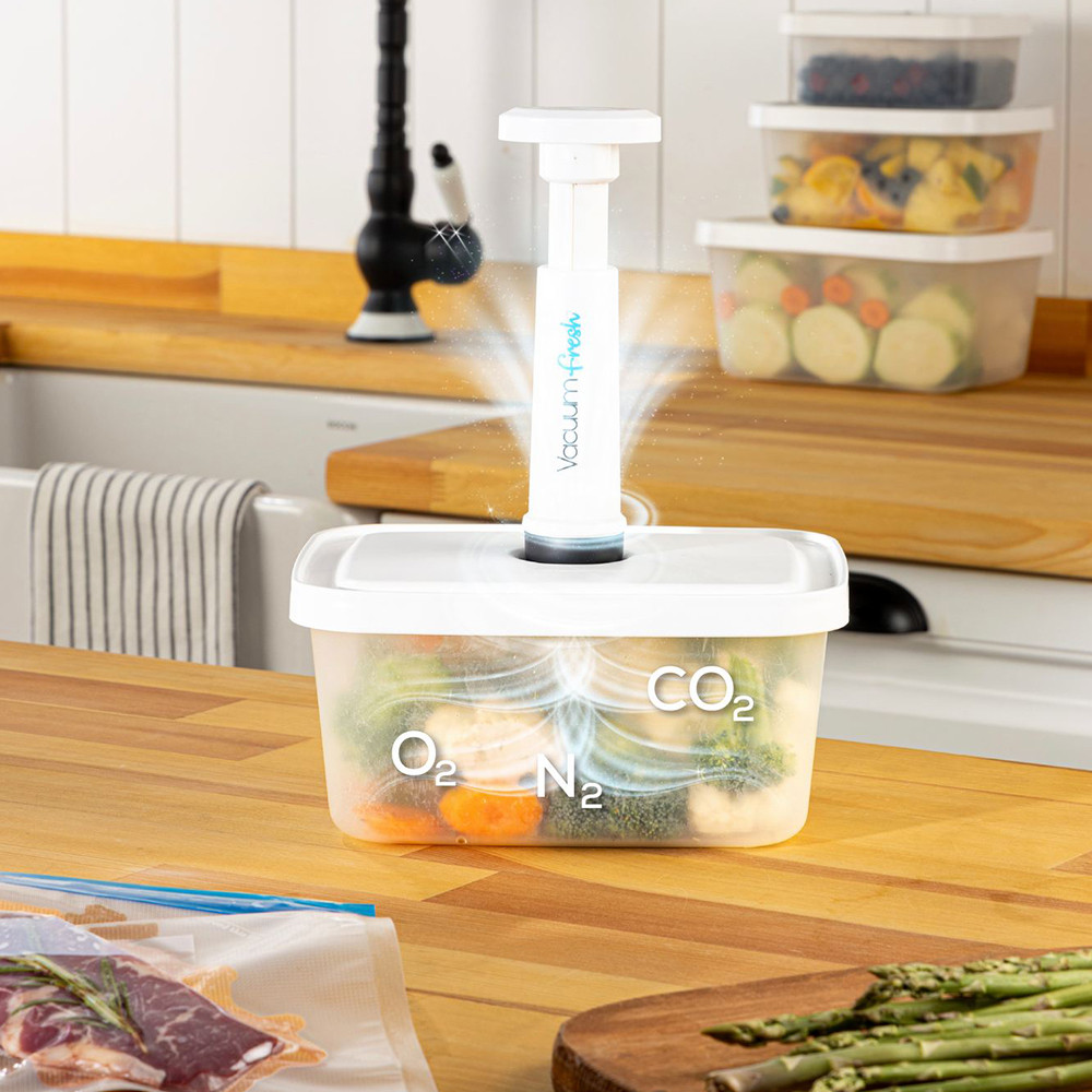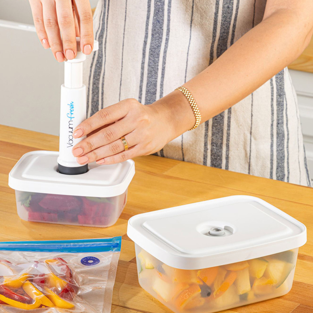 Vakuový systém vám umožní snížit množství vzduchu v nádobách a sáčcích, což pomáhá vašim potravinám udržet si čerstvost a texturu po delší dobu. Je to ideální volba pro skladování zeleniny, ovoce, masa nebo zbytků.