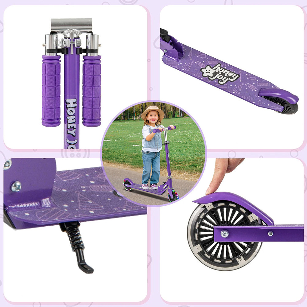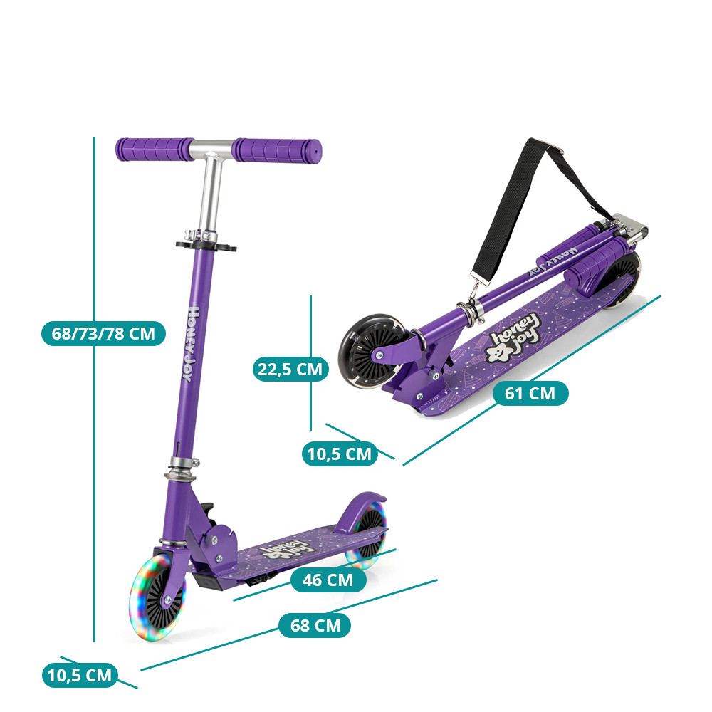 Fialový rám a vzorovaná nášlapná plocha vytvářejí přitažlivý vzhled. Svítící kola vydávají jemné světlo během jízdy, což oživuje společné procházky a odpolední hry.