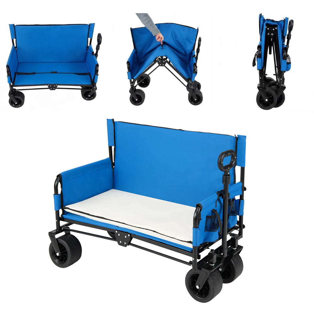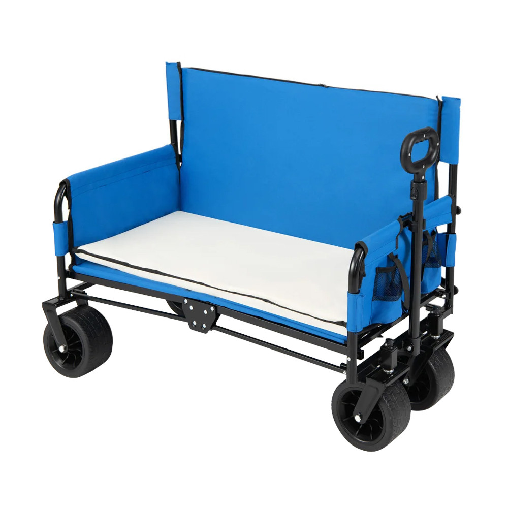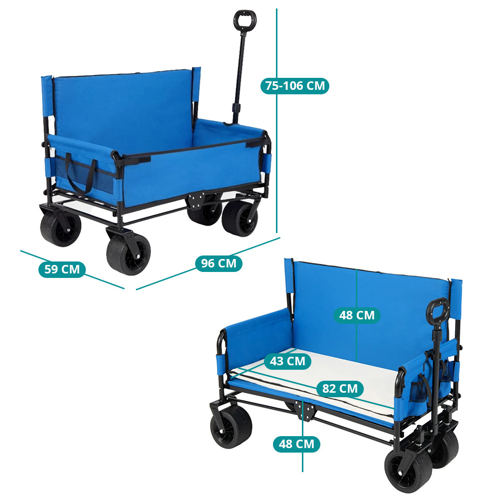 Vozík lze rychle přeměnit na lavici, takže nemusíte nosit samostatnou židli. Měkké sedadlo a opěradlo s pěnovou výplní poskytují pohodlnou oporu, ať už si chcete na chvíli odpočinout nebo déle pozorovat okolí.