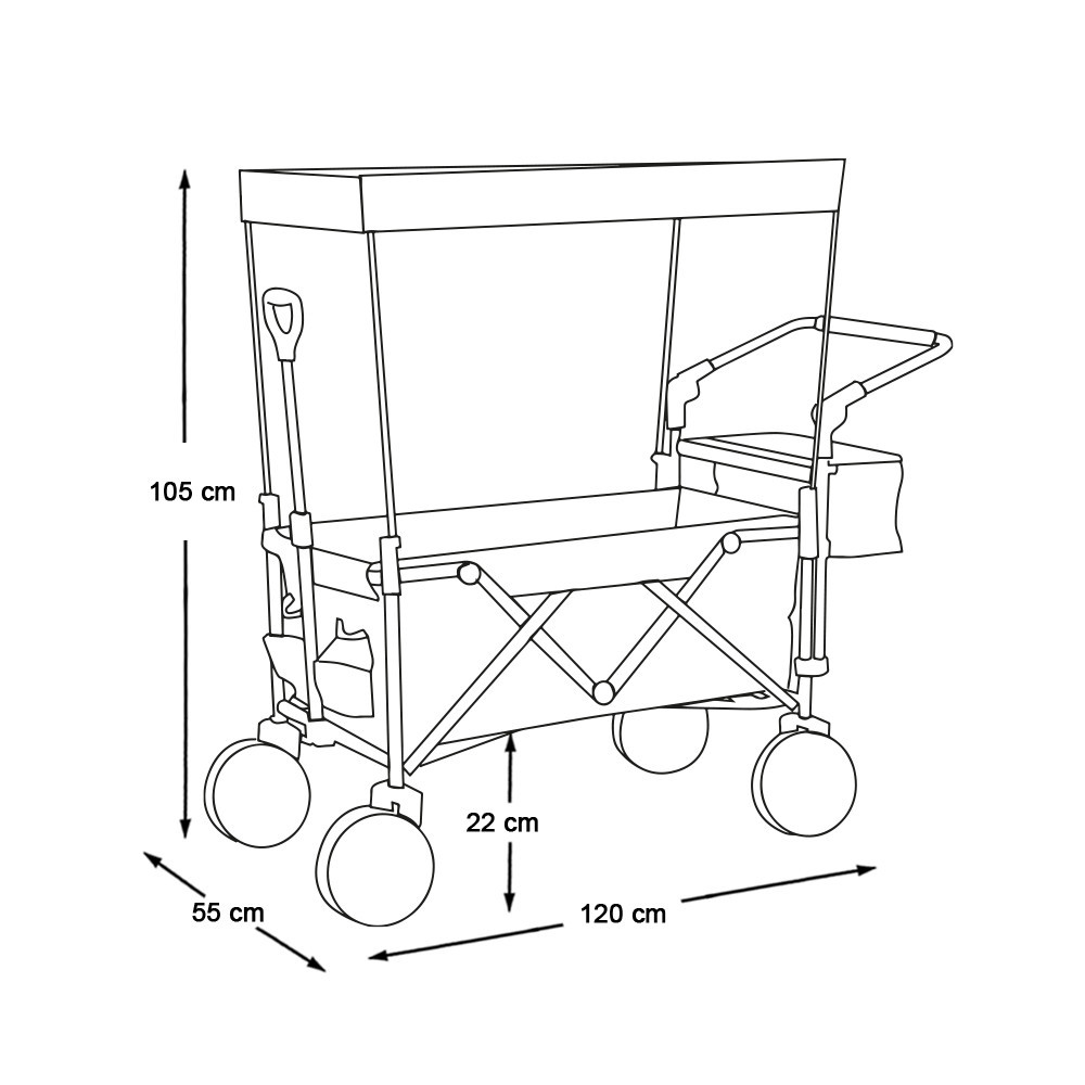 Tažný vozík má odnímatelnou vnitřní podšívku a střecha se snadno čistí, rám lze snadno složit, takže jej můžete vzít kamkoli s sebou. Skladování nevyžaduje mnoho místa, lze jej umístit do garáže nebo dokonce do skříně. Na boku má 2 menší kapsy a také samostatný, odnímatelný úložný prostor pro další věci a potraviny.
