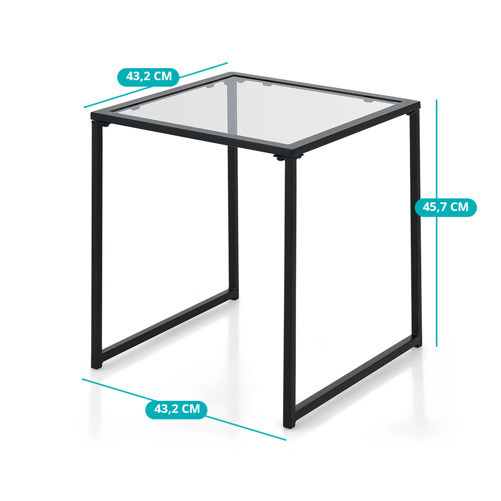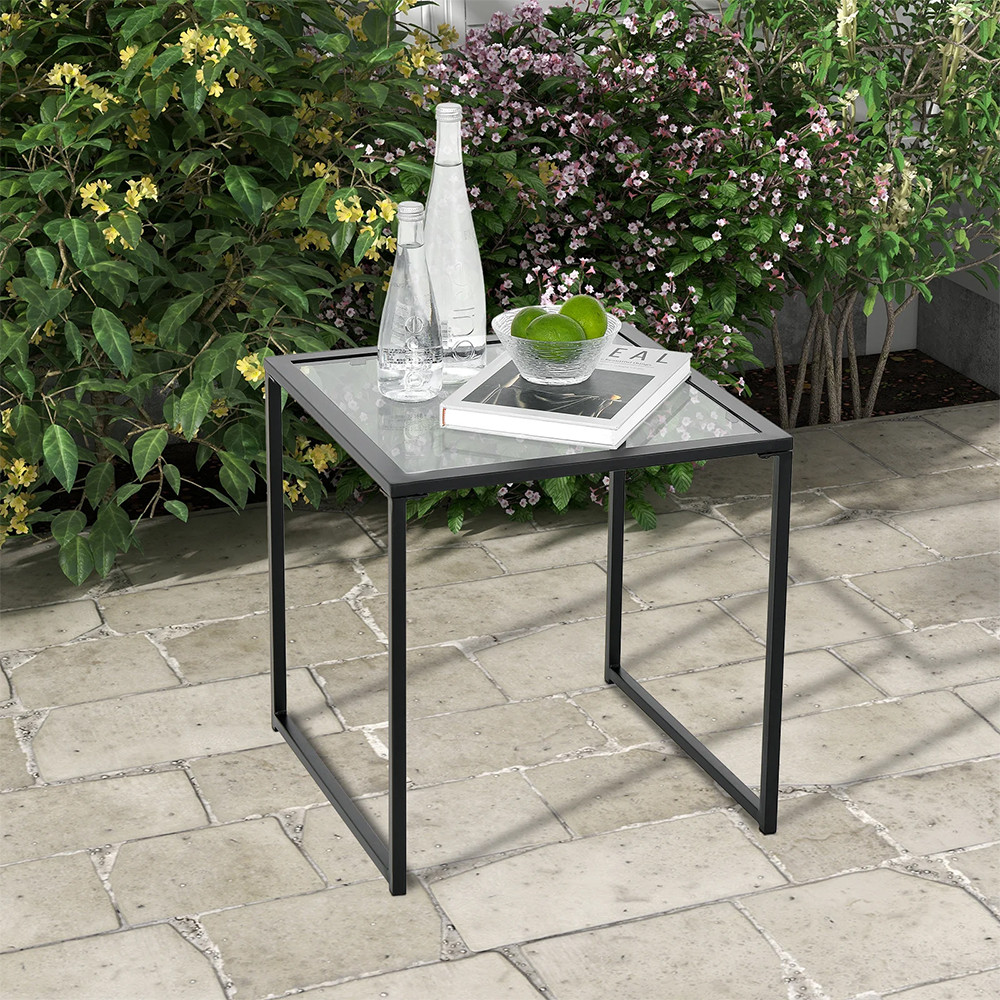Černý kovový rám a průhledná skleněná deska mu dodávají moderní, ale decentní vzhled. Snadno se kombinuje s různými styly venkovního nebo vnitřního nábytku.