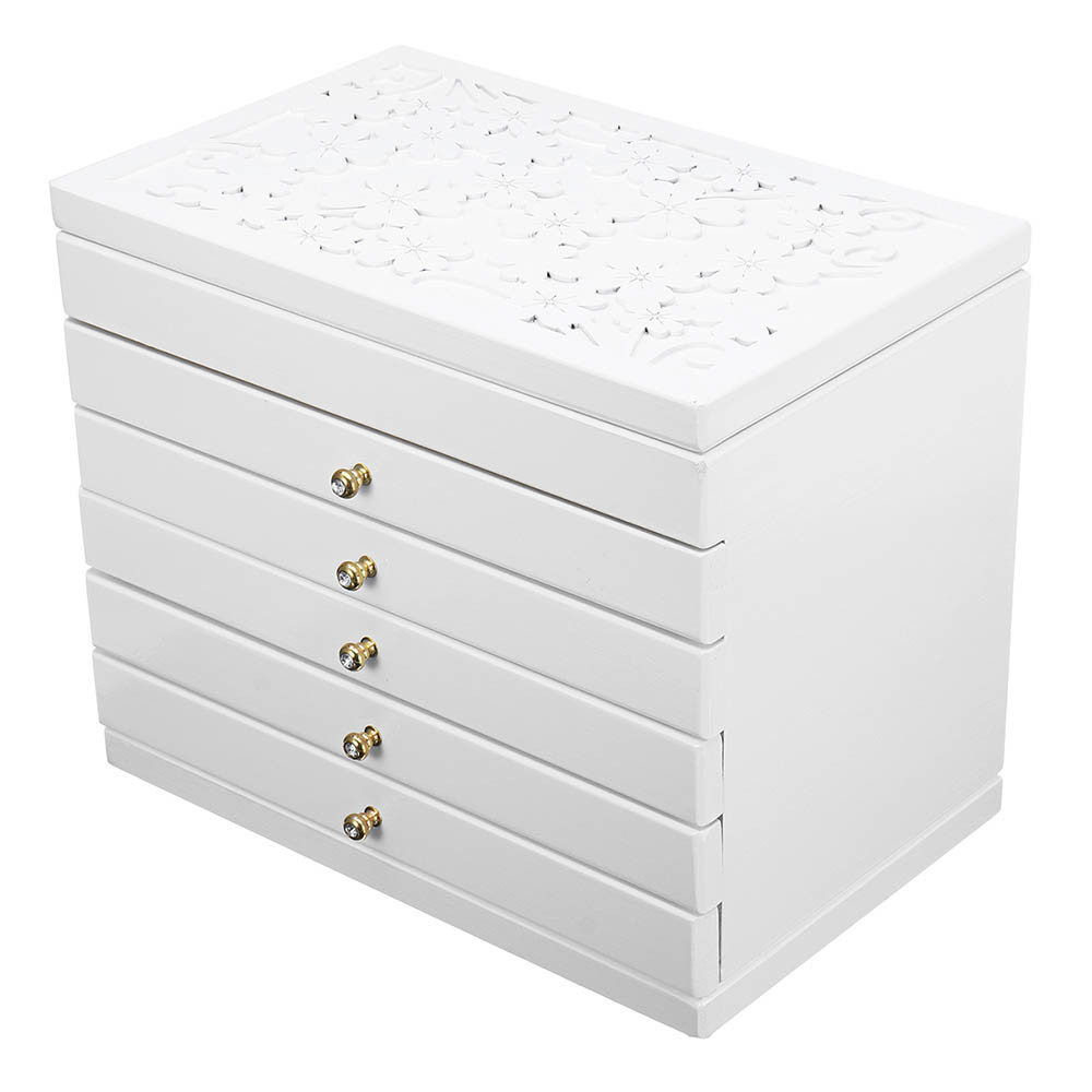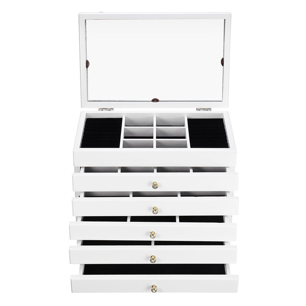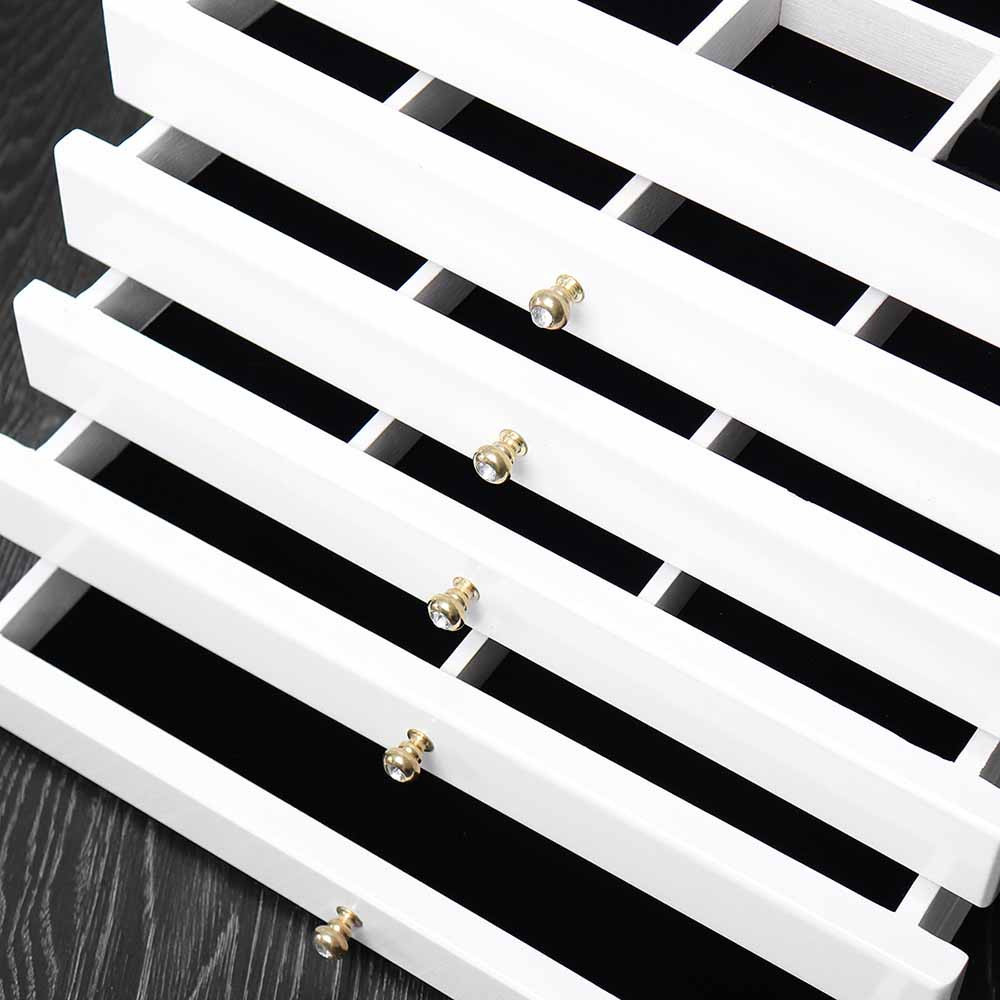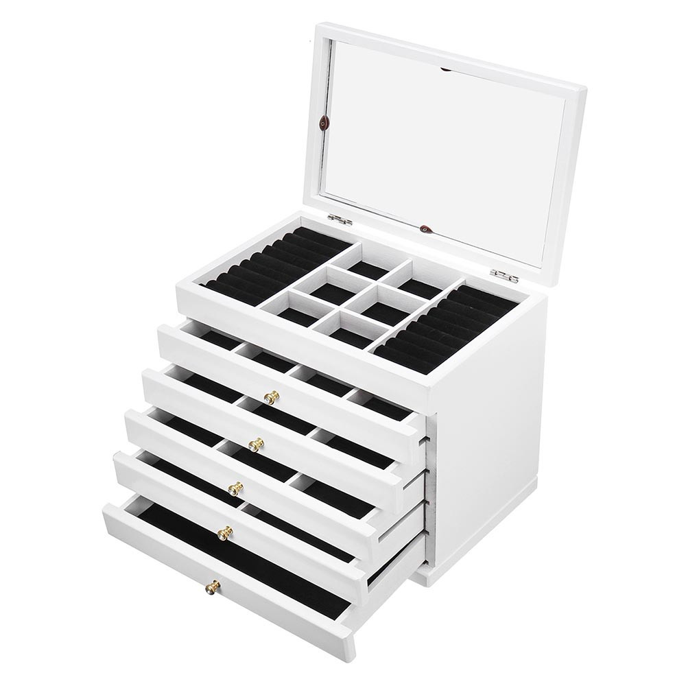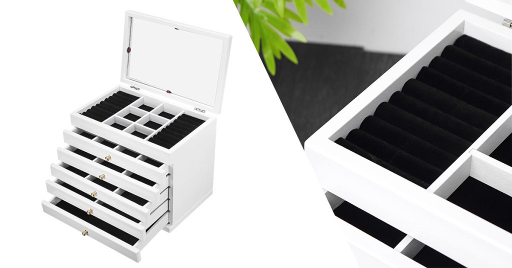 Tento 6 přihrádkový šperkovník je ideální volbou pro všechny, kteří chtějí mít své oblíbené šperky přehledně uspořádané. Pět výsuvných šuplíků a jednotlivé přihrádky zajistí, že každý doplněk bude mít své vlastní místo. Speciální válečky na prsteny zabraňují poškrábání, takže i dražší šperky budou v bezpečí.