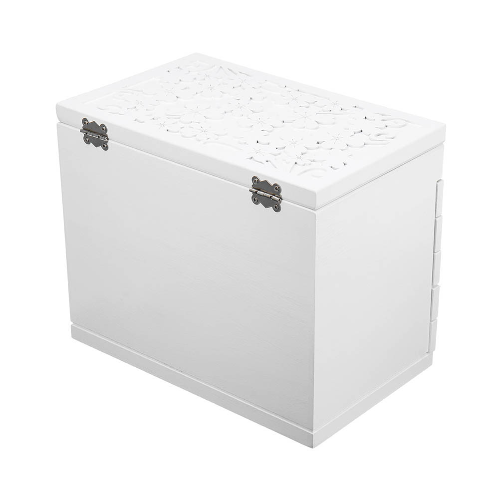 Díky čistě bílé barvě a klasickému designu se tento šperkovník snadno začlení do jakéhokoliv interiéru. Ať už jej umístíte na toaletní stolek, komodu nebo poličku, nejenže vám pomůže s organizací, ale zároveň bude i elegantním dekorativním prvkem.