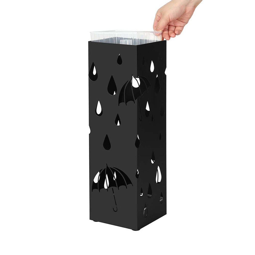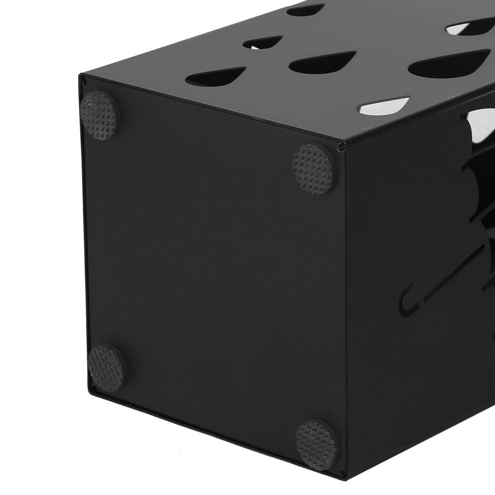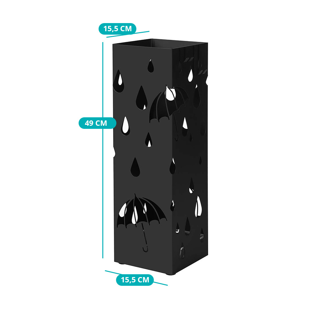Stojan s kompaktním půdorysem 15,5 × 15,5 cm poskytuje dostatek místa i pro více dlouhých deštníků. Součástí balení jsou 4 háčky (2 dlouhé, 2 krátké), ideální pro skládací deštníky, hole nebo drobné doplňky.