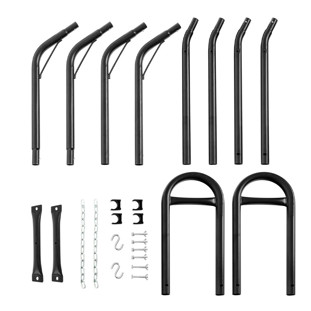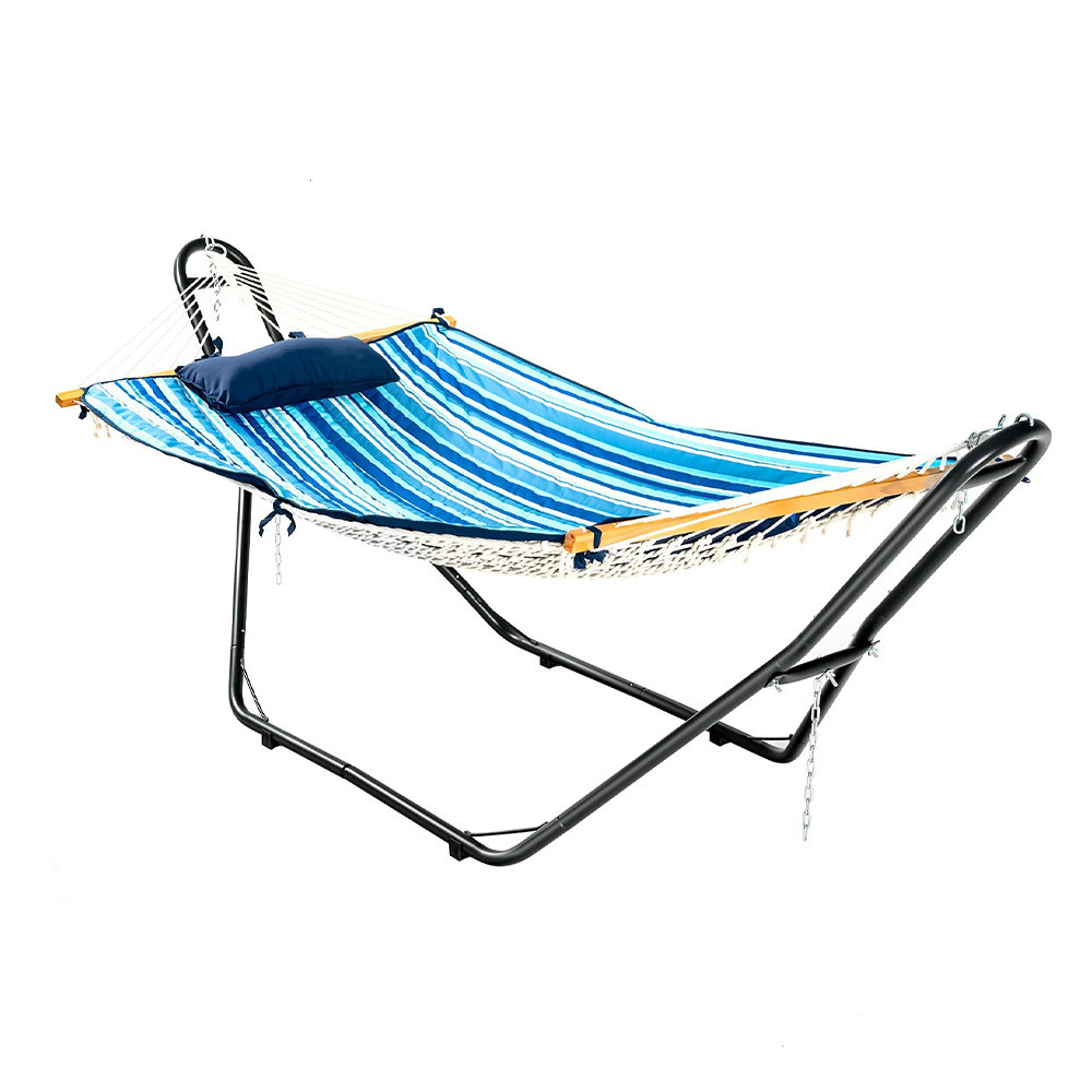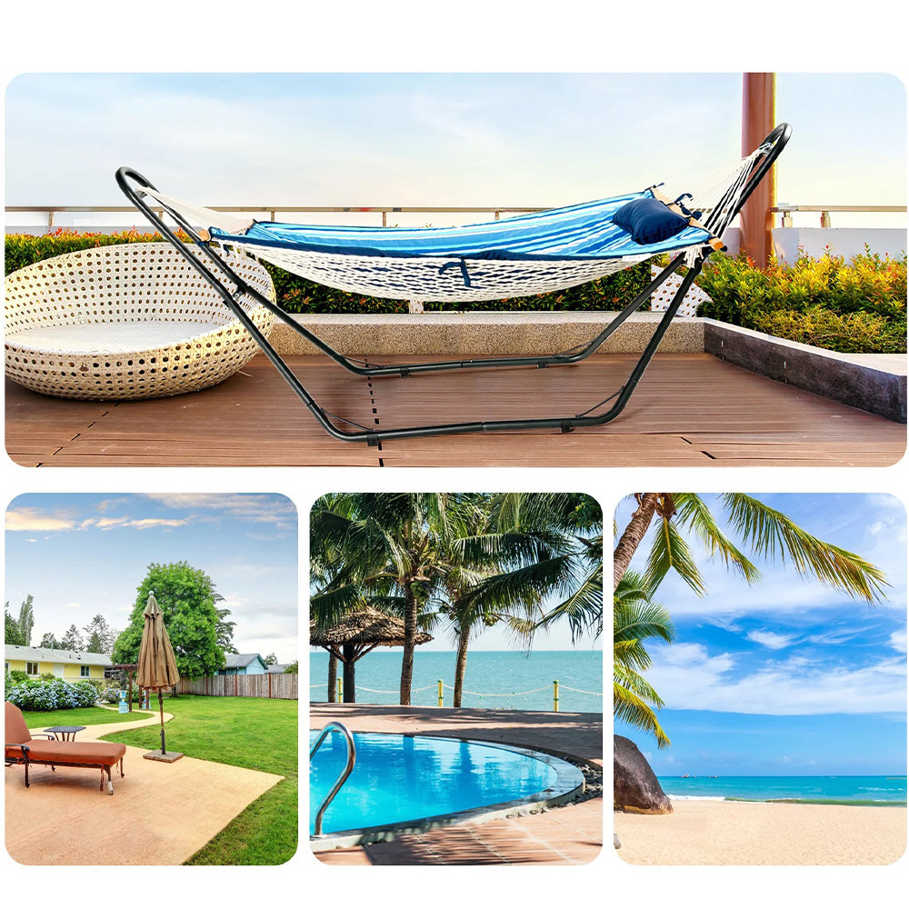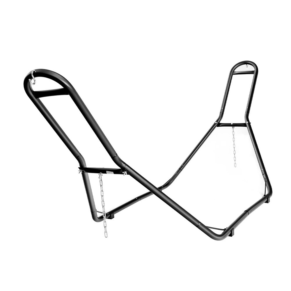 Dva S-čkové háčky a nastavitelný řetěz umožňují bezpečné připevnění většiny standardních houpacích sítí. Ať už se jedná o brazilskou nebo tradiční látkovou houpací síť, tento stojan poskytuje stabilní oporu pro obě varianty.