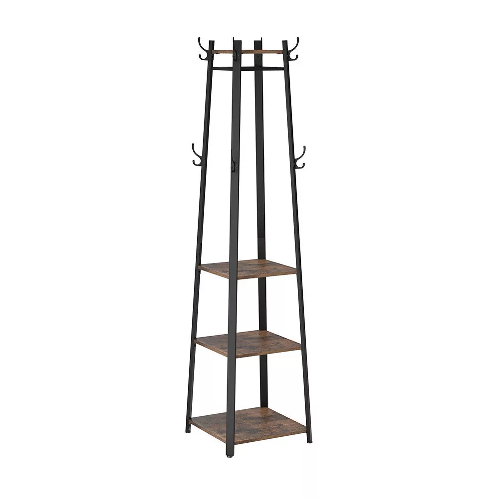 Lehce se zužující tvar nejenže vypadá vizuálně zajímavě, ale také zajišťuje větší stabilitu stojanu na kabáty. Matný černý ocelový rám poskytuje spolehlivou oporu, zatímco 3 police nabízejí různé možnosti úložného prostoru pro košíky, boty nebo dekorace.
