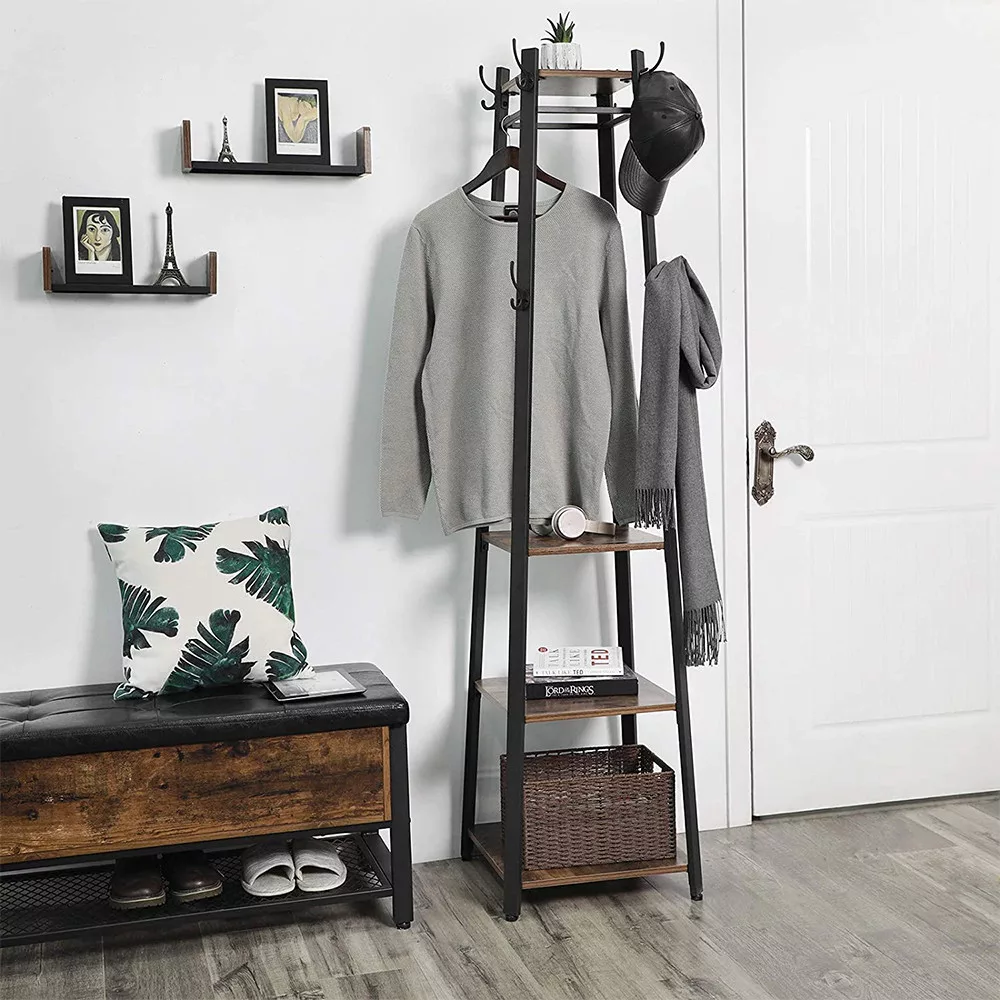 Kombinace ocelového rámu v industriálním stylu a rustikálních polic vytváří moderní, ale útulnou atmosféru. Stojan není jen užitečným úložným řešením, ale také výrazným kouskem domácího dekoru, který okamžitě vylepší vstup nebo roh obývacího pokoje.