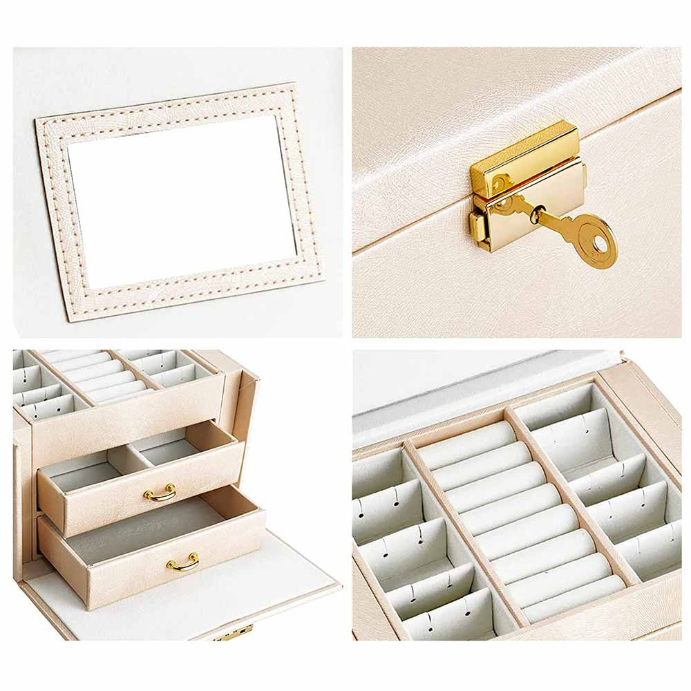 Uspořádejte a chraňte své šperky stylově a přehledně díky této krásné šperkovnici! Po zavření působí jako elegantní box, ale po otevření odhalí množství přihrádek, zásuvek a válečků na prsteny, které zajistí dokonalý přehled o vašich oblíbených doplňcích. Díky vestavěnému zrcátku si můžete šperky pohodlně vyzkoušet kdekoli.