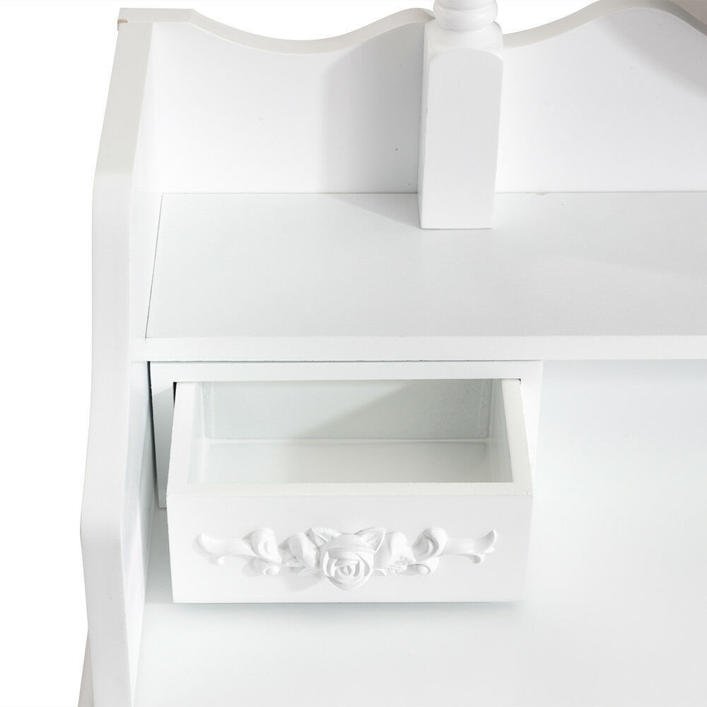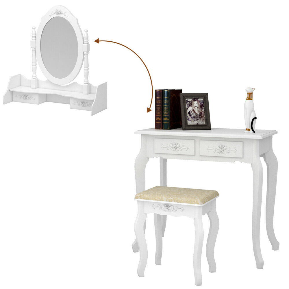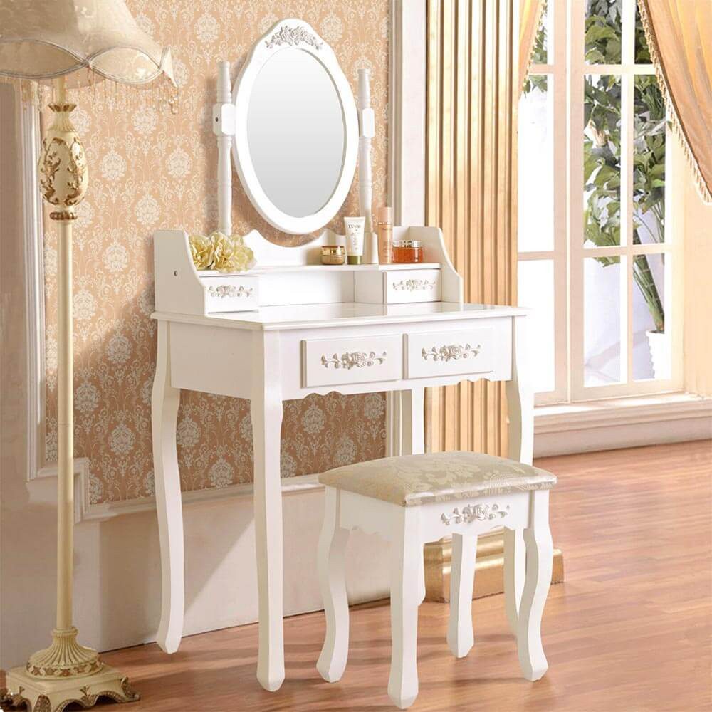 Toaletní stolek disponuje čtyřmi zásuvkami: dvě menší jsou umístěny na horní poličce, zatímco dvě větší pod hlavní deskou. Veškeré potřebné doplňky tak budou snadno dostupné. Díky odnímatelné horní části lze stolek využít i jako psací stůl, což umožňuje jeho univerzální začlenění do jakéhokoli interiéru.