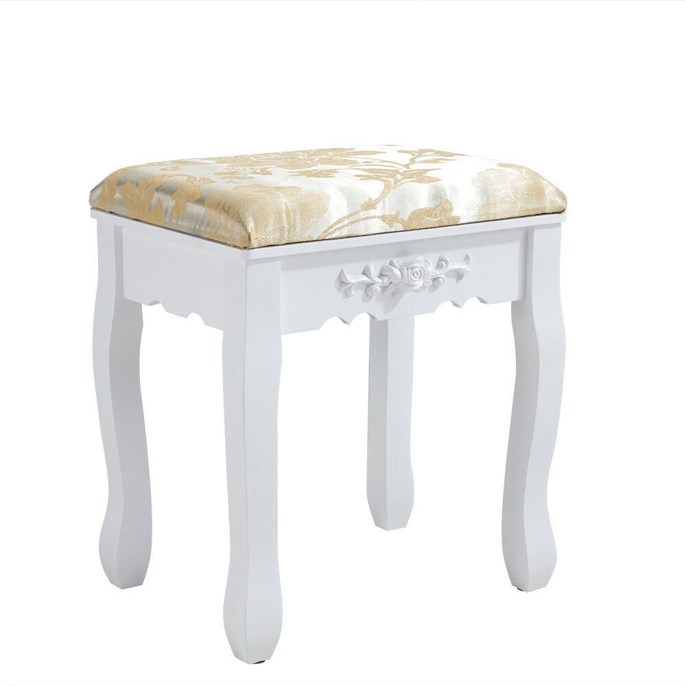 Klasické linie a reliéfní vyřezávané dekorace dodávají stolku romantický a elegantní vzhled. Pevná dřevěná konstrukce zajišťuje stabilitu a dlouhou životnost, zatímco polstrovaná sedací část taburetu nabízí maximální pohodlí při každodenním používání.