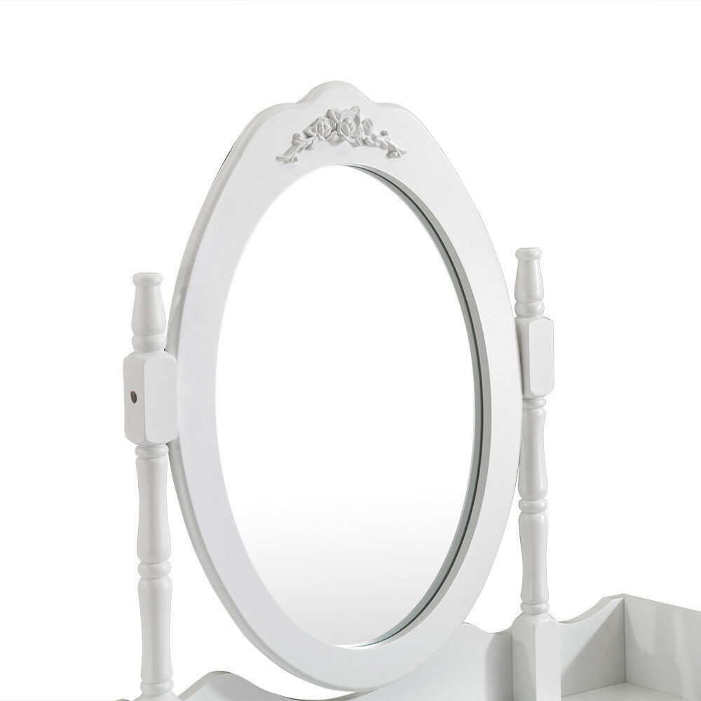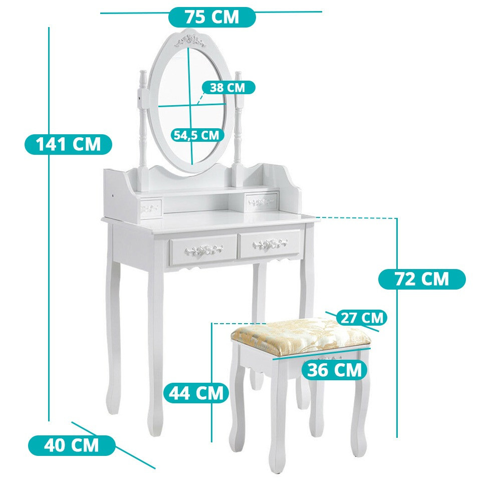Oválné zrcadlo je ideální pro líčení a úpravu účesu, jeho velikost poskytuje dokonalý pohled na obličej. Prostorná stolní deska navíc nabízí dostatek místa pro často používanou kosmetiku a doplňky.