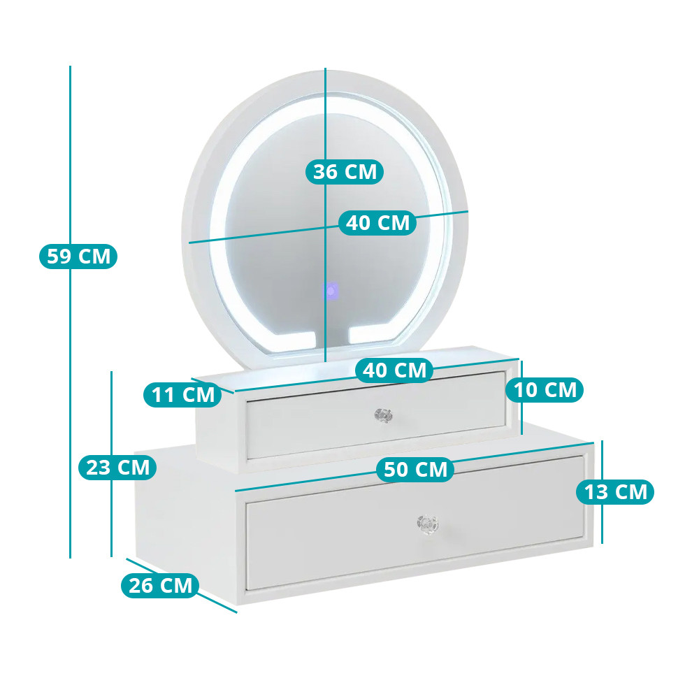Dvě zásuvky poskytují dostatek prostoru pro kosmetiku, šperky a příslušenství na make-up. Zásuvky jsou vyjímatelné a mohou být používány samostatně, zatímco křišťálové úchyty dodávají celkovému vzhledu elegantní nádech.